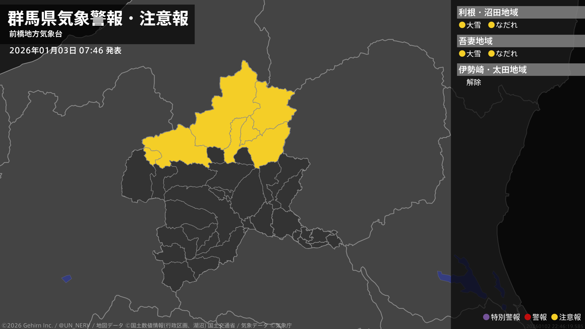 【群馬県 気象警報・注意報 2026年01月03日 07:46】北部では、3日夜のはじめ頃まで大雪に、4日までなだれに注意してください。#気象警報注意報 #群馬県