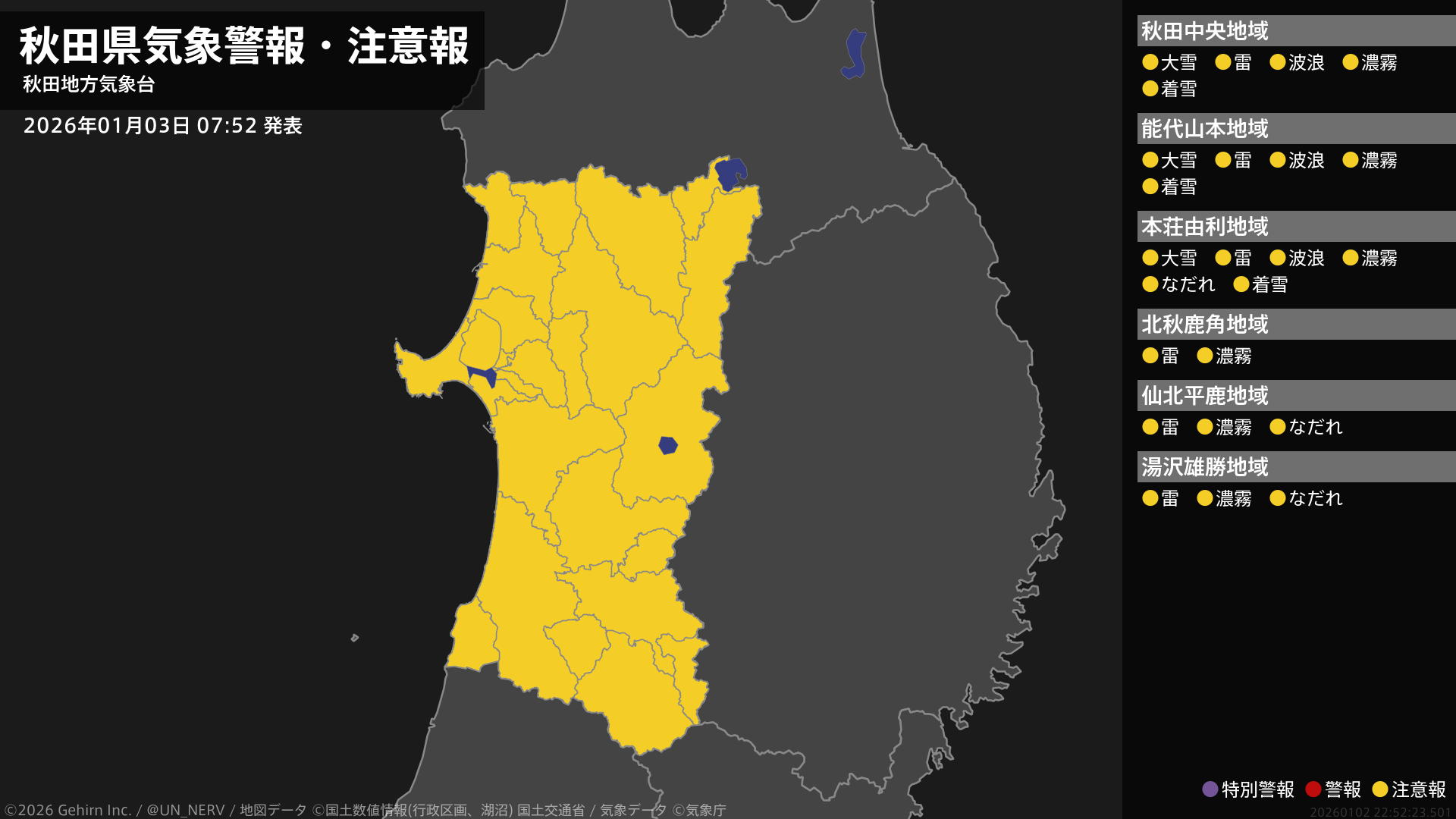 【秋田県 気象警報・注意報 2026年01月03日 07:52】沿岸では、大雪や高波、電線等への着雪に注意してください。秋田県では、落雷や濃霧による視程障害、なだれに注意してください。#気象警報注意報 #秋田県