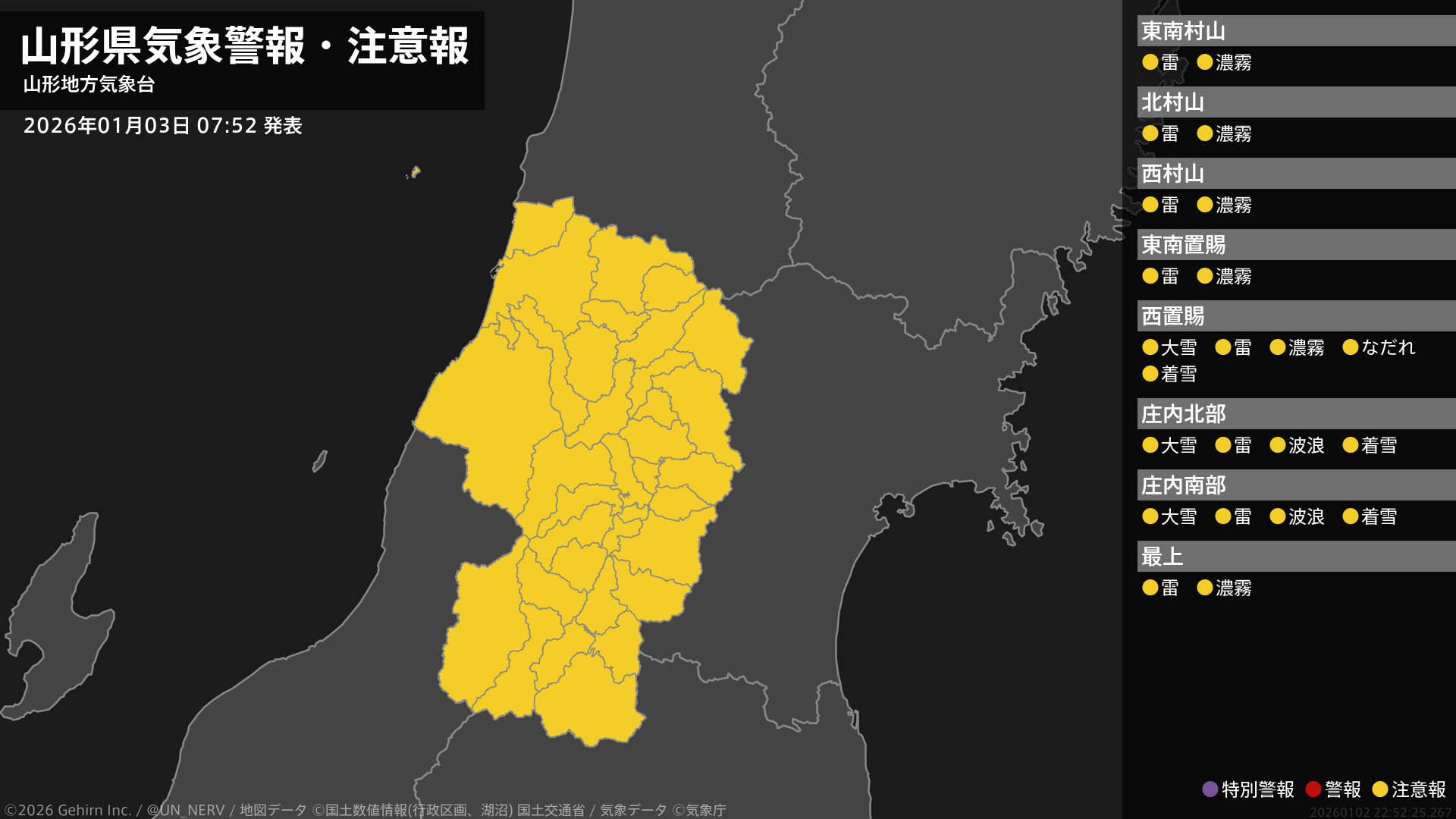【山形県 気象警報・注意報 2026年01月03日 07:52】置賜、庄内では大雪や電線等への着雪に、庄内では高波に、山形県では落雷に、村山、置賜、最上では濃霧による視程障害に、置賜ではなだれに注意してください。#気象警報注意報 #山形県