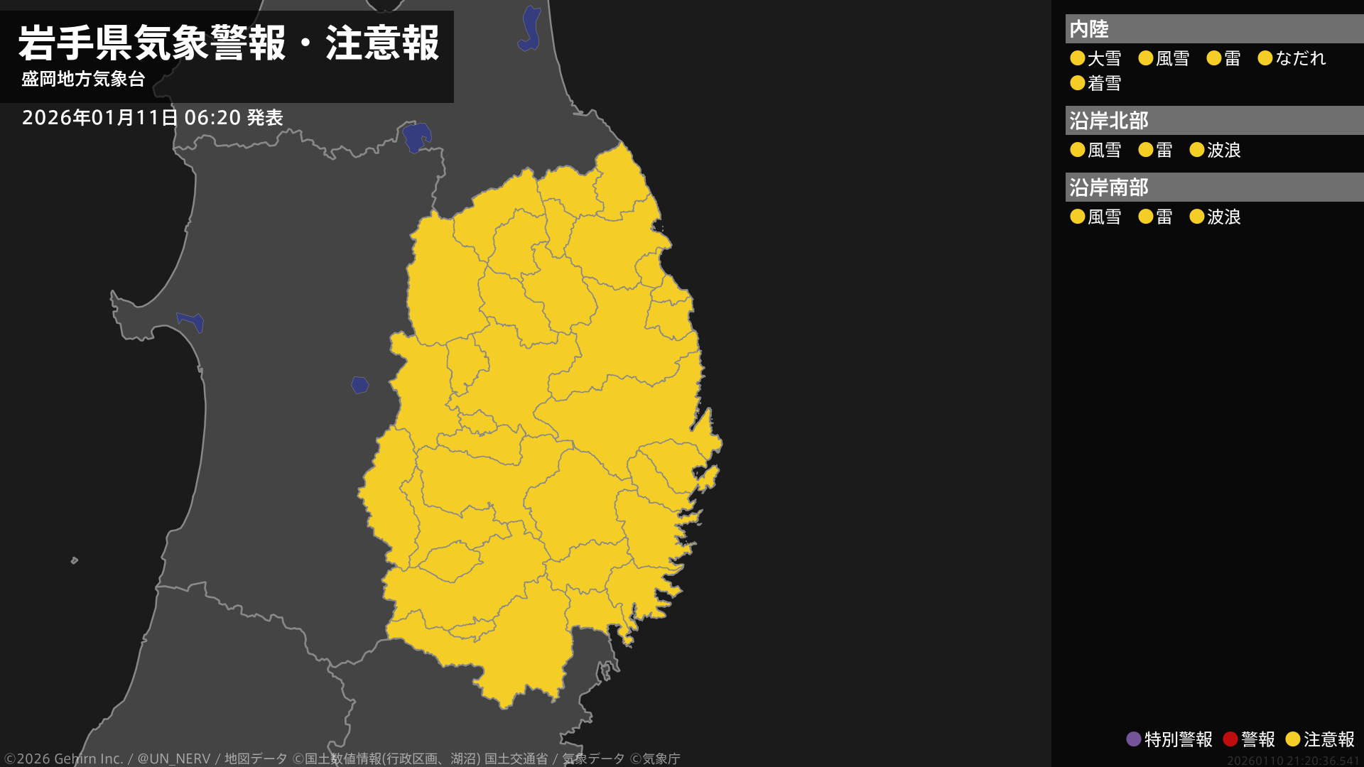 【岩手県 気象警報・注意報 2026年01月11日 06:20】岩手県では、風雪や高波、落雷に注意してください。内陸では、大雪やなだれ、電線等への着雪に注意してください。#気象警報注意報 #岩手県