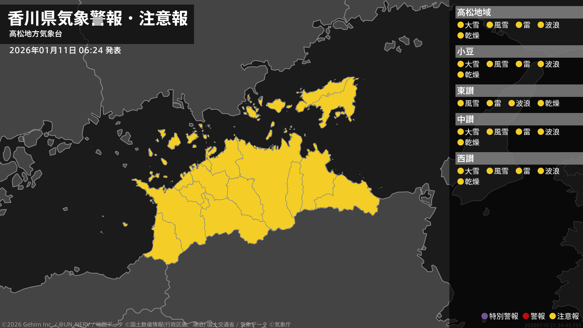 【香川県 気象警報・注意報 2026年01月11日 06:24】香川県では、11日夜遅くまで風雪や大雪、高波、落雷に、12日まで空気の乾燥した状態が続くため、火の取り扱いに注意してください。#気象警報注意報 #香川県