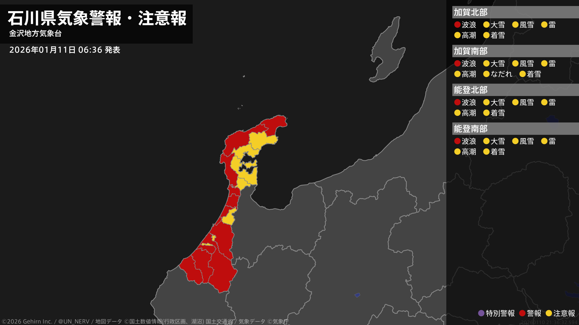 【石川県 気象警報・注意報 2026年01月11日 06:36】石川県では、高波に警戒してください。#気象警報注意報 #石川県