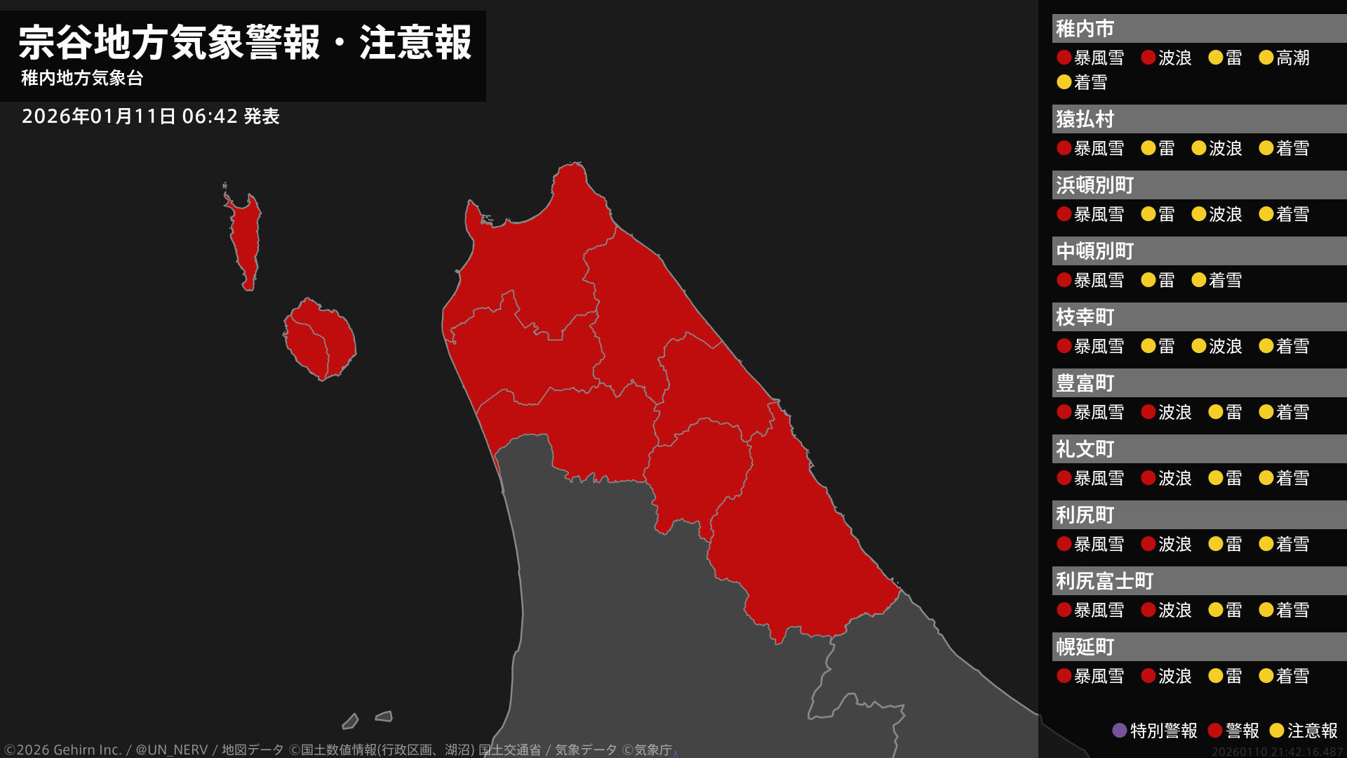 【宗谷地方 気象警報・注意報 2026年01月11日 06:42】宗谷地方では、11日夜遅くまで暴風雪や高波に警戒してください。#気象警報注意報 #宗谷地方