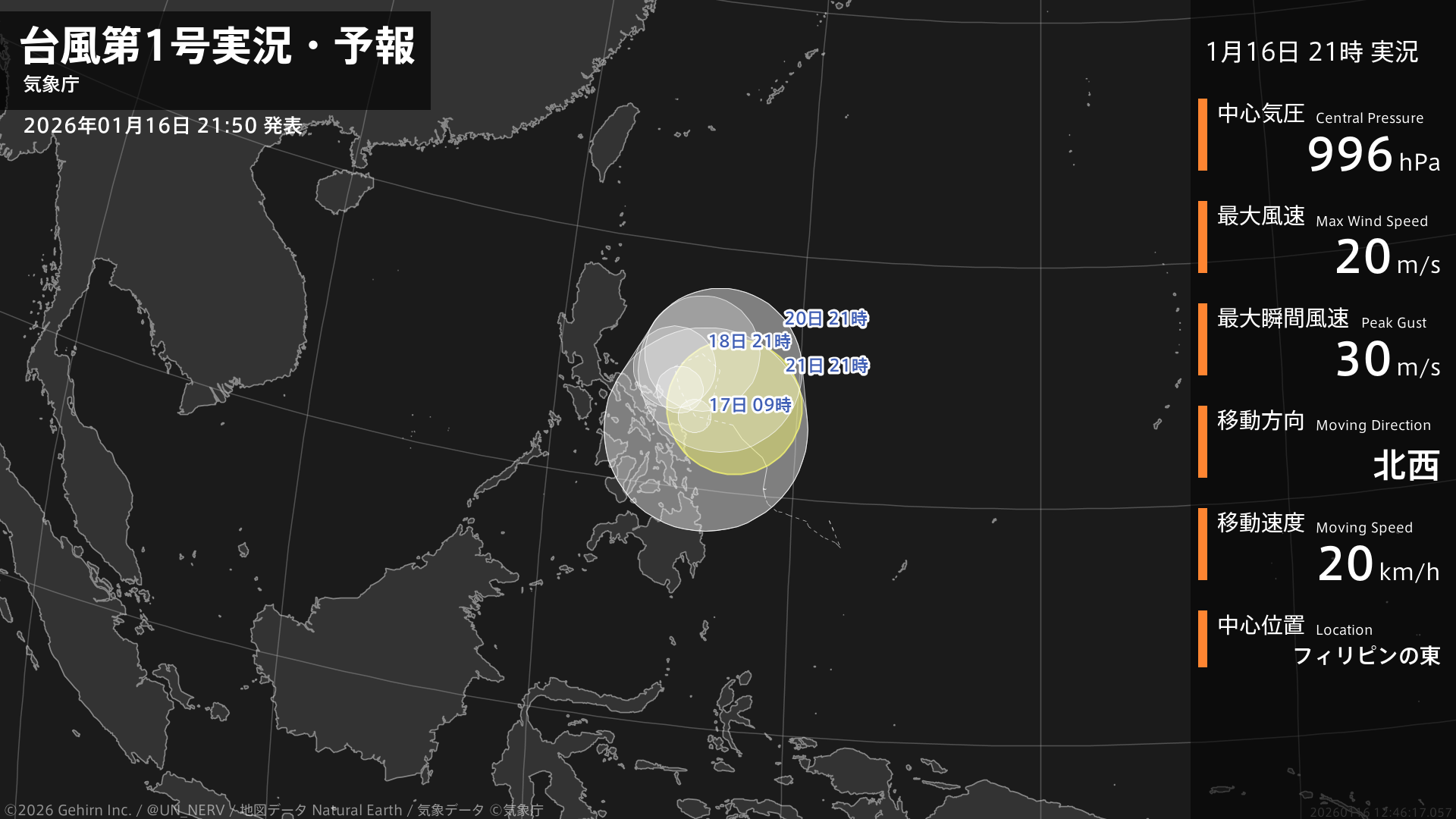 【台風第1号実況・予報 2026年01月16日 21:46】台風第1号(ノケーン)は、フィリピンの東を1時間に20キロの速さで北西に進んでいます。#台風情報
