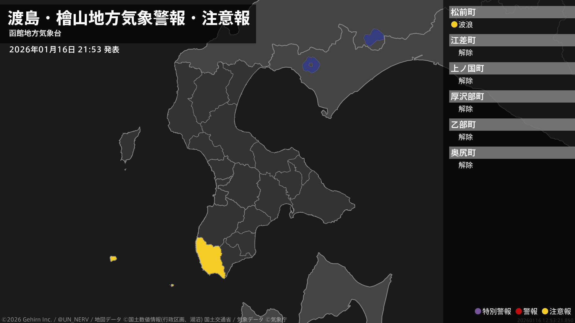 【渡島・檜山地方 気象警報・注意報 2026年01月16日 21:53】渡島地方では、17日明け方まで高波に注意してください。#気象警報注意報 #渡島地方 #檜山地方