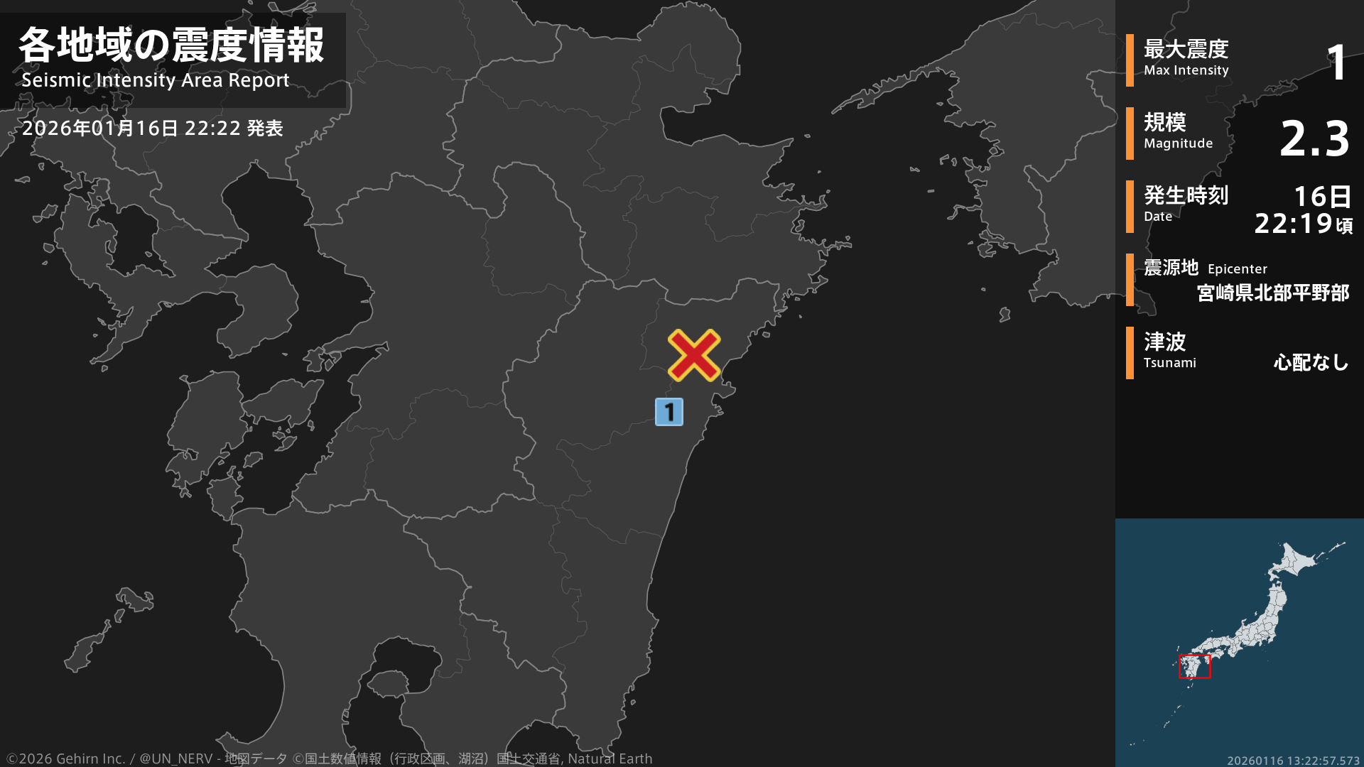 【地震情報 2026年1月16日】22時19分頃、宮崎県北部平野部を震源とする地震がありました。震源の深さは約10km、地震の規模はM2.3、最大震度1を宮崎県で観測しています。この地震による津波の心配はありません。#地震 #宮崎県