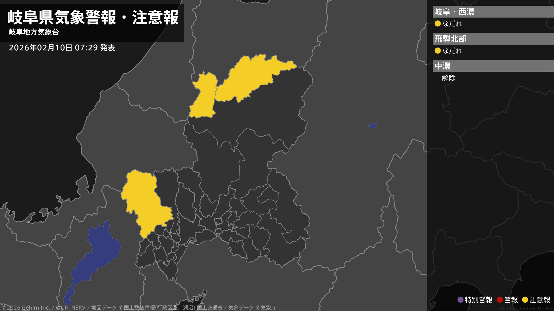 【岐阜県 気象警報・注意報 2026年02月10日 07:29】