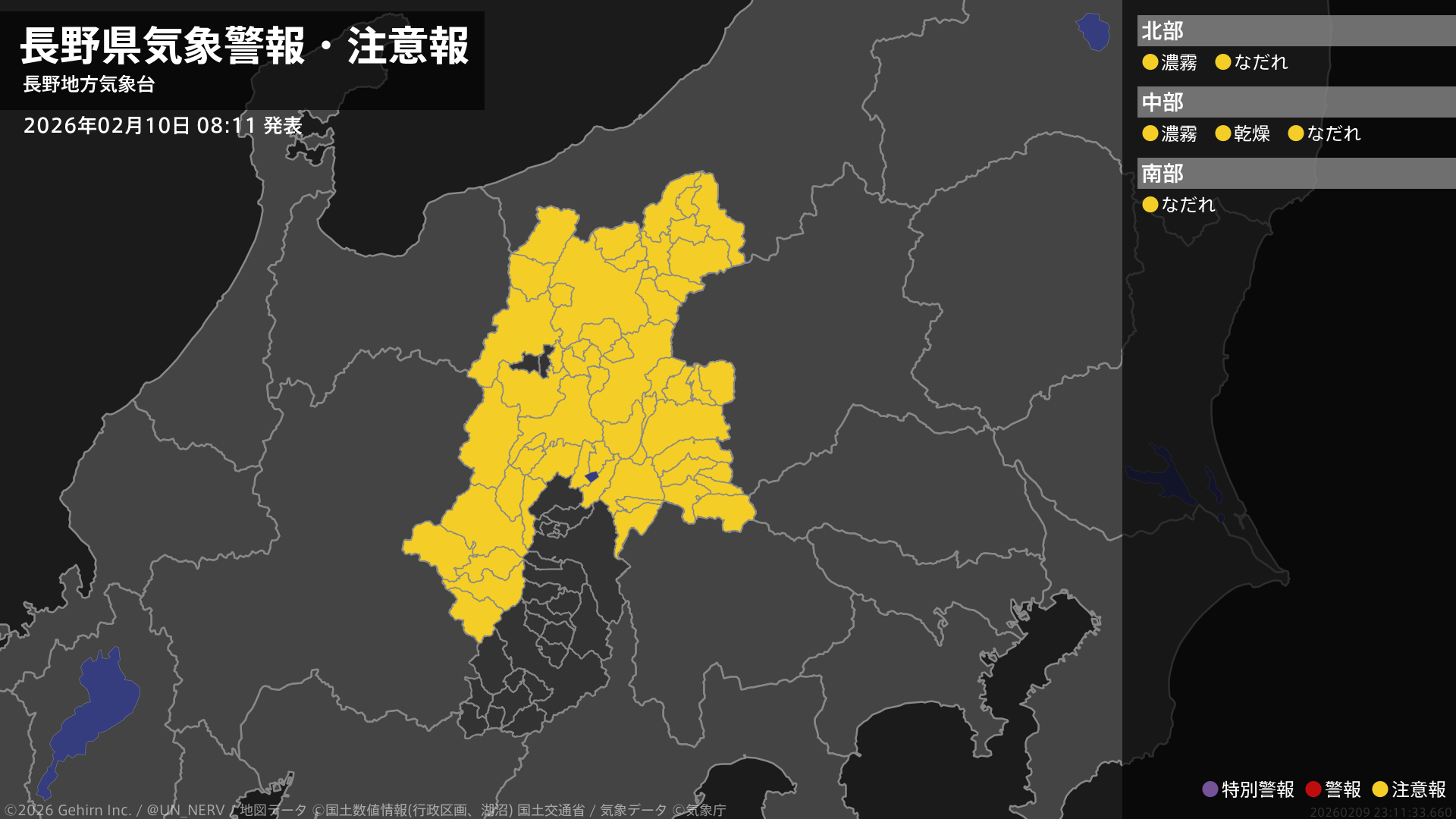 【長野県 気象警報・注意報 2026年02月10日 08:11】