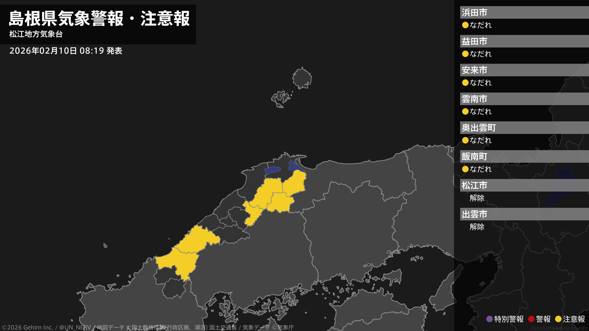 【島根県 気象警報・注意報 2026年02月10日 08:19】