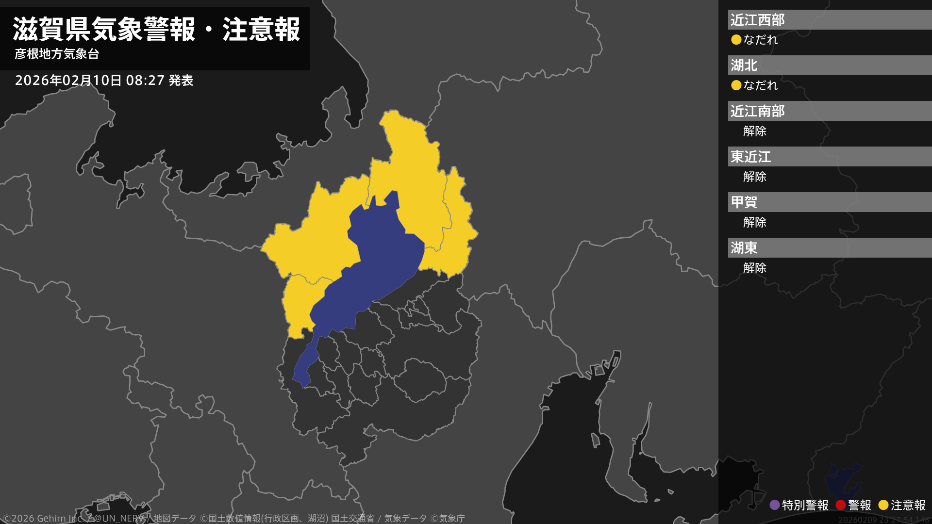 【滋賀県 気象警報・注意報 2026年02月10日 08:27】