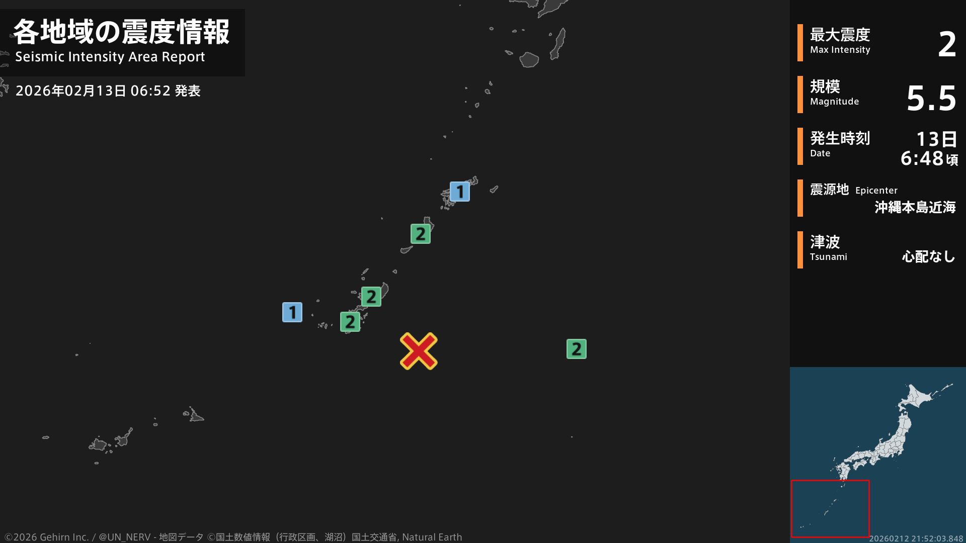 6時48分頃、沖縄本島近海を震源とする地震がありました。地震の規模はM5.1程度、最大震度3程度と推定されています。この情報は気象庁の予報に基づく推定です。情報は誤差を含む場合があります。