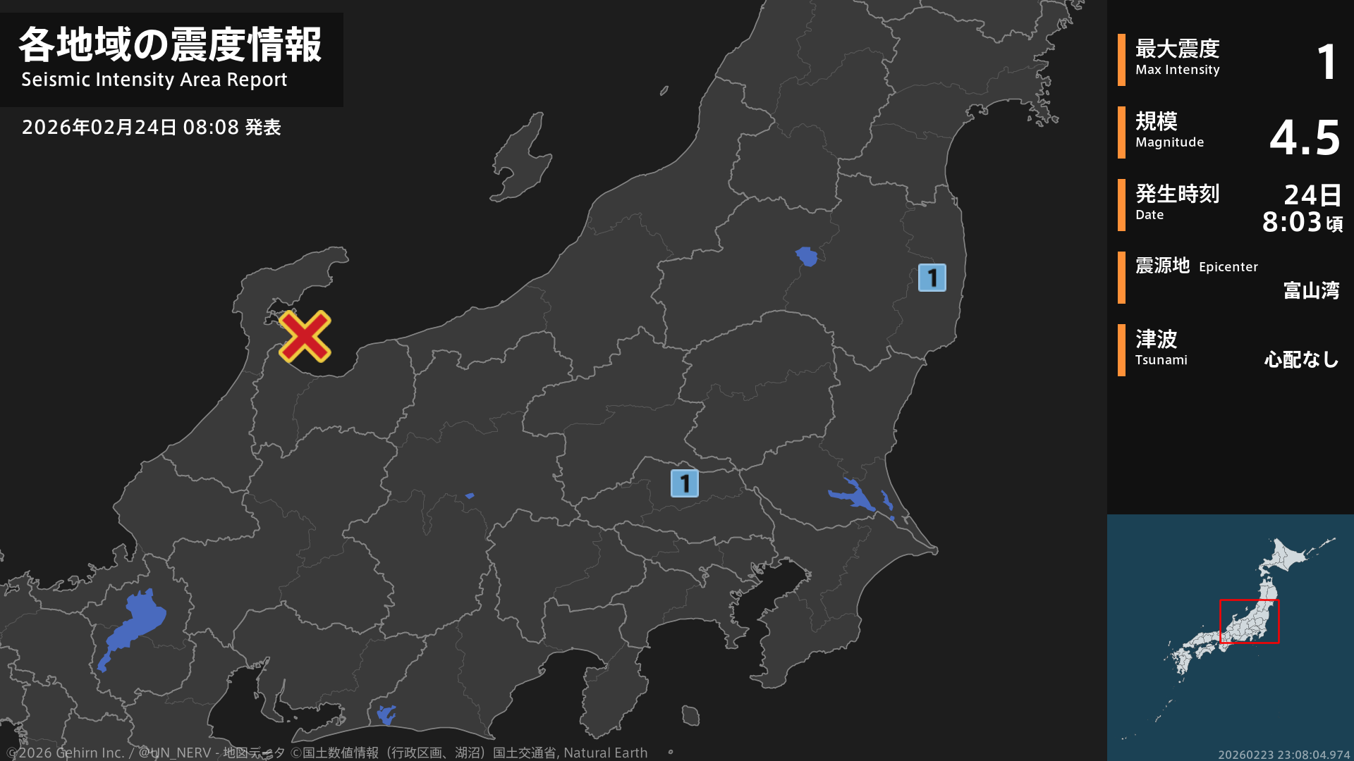 8時3分頃、富山湾を震源とする地震がありました。震源の深さは約270km、地震の規模はM4.5、最大震度1を福島県、埼玉県で観測しています。この地震による津波の心配はありません。
