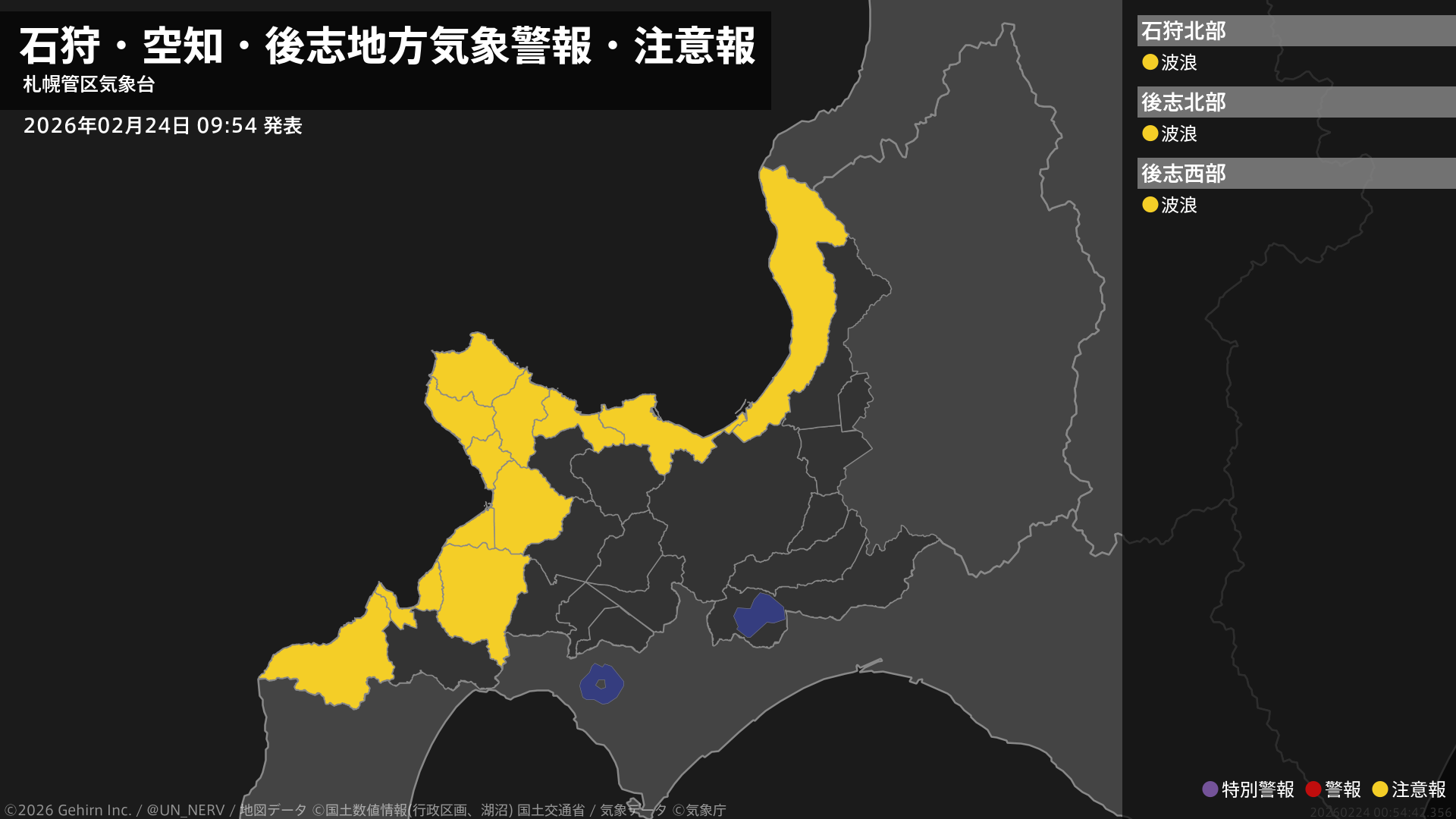 【石狩・空知・後志地方 気象警報・注意報 2026年02月24日 09:54】