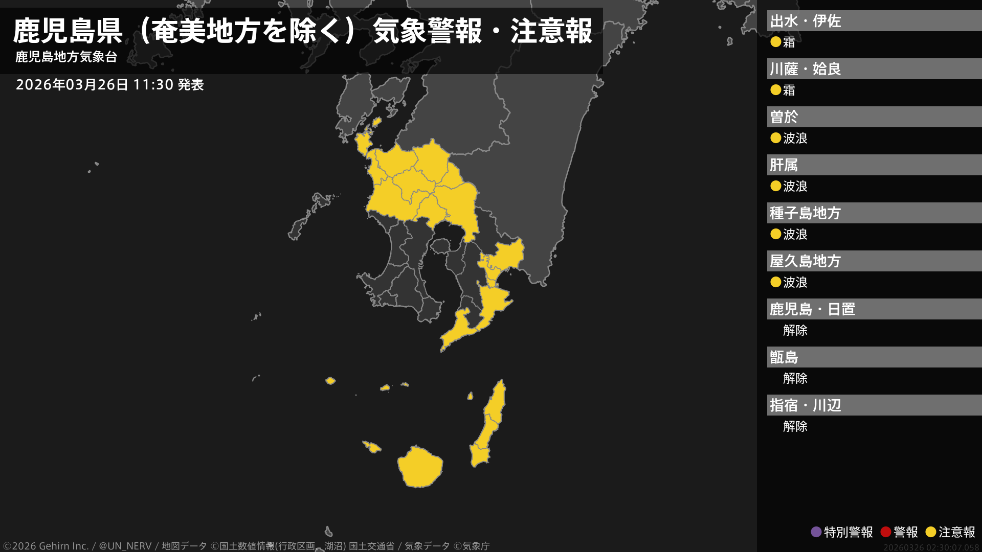 【鹿児島県(奄美地方を除く) 気象警報・注意報 2026年03月26日 11:30】