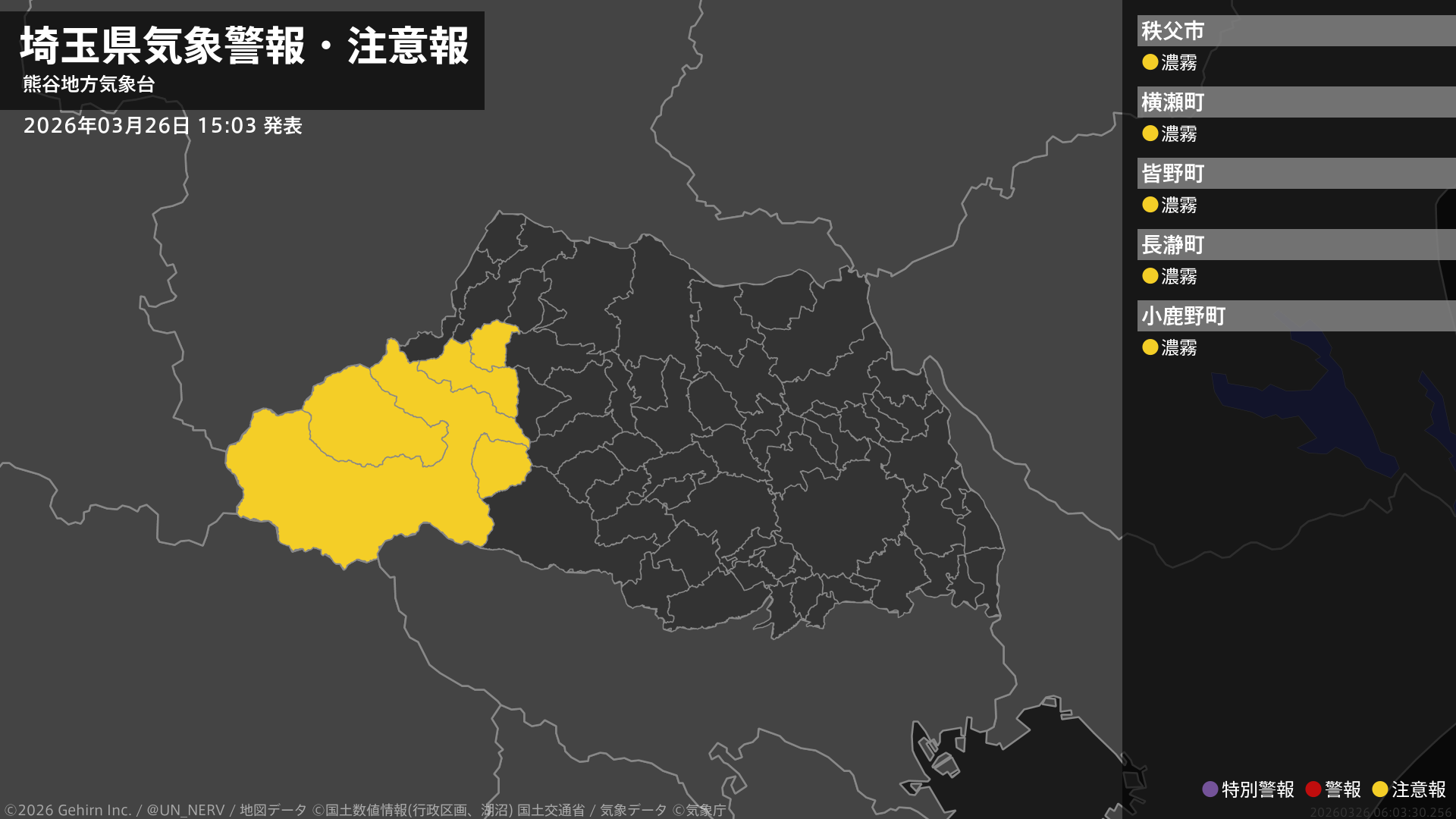 【埼玉県 気象警報・注意報 2026年03月26日 15:03】