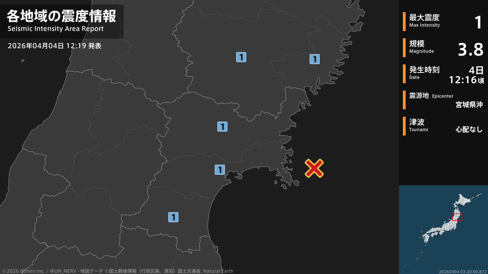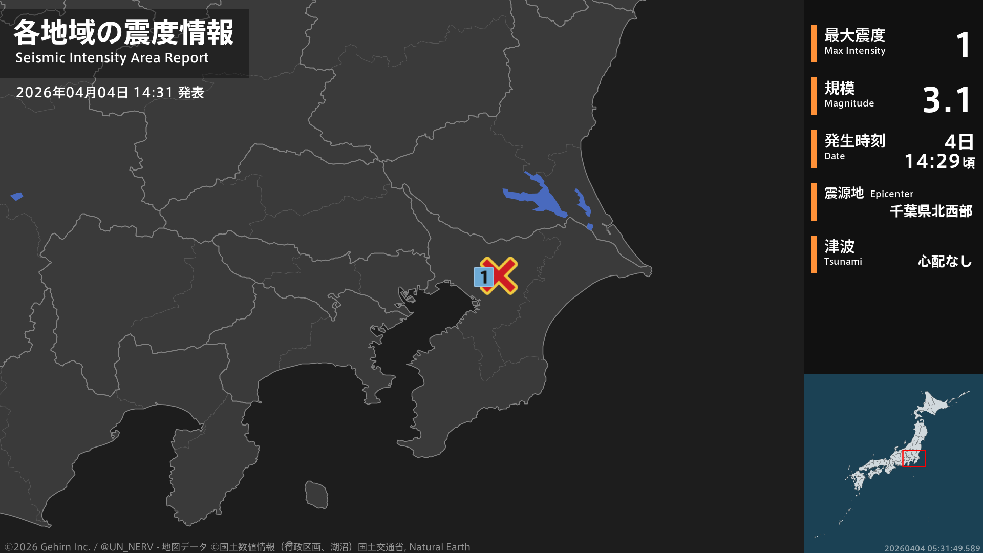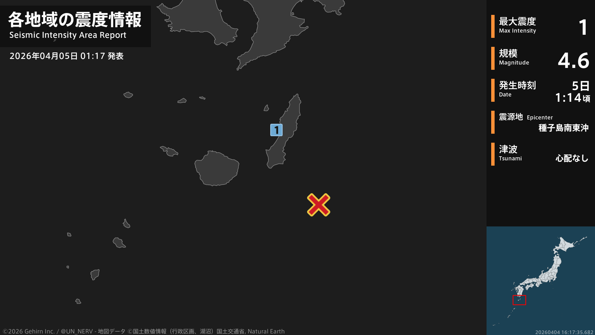 【地震情報 2026年4月5日】1時14分頃、種子島南東沖を震源とする地震がありました。震源の深さは約20km、地震の規模はM4.6、最大震度1を鹿児島県で観測しています。この地震による津波の心配はありません。#地震 #鹿児島県