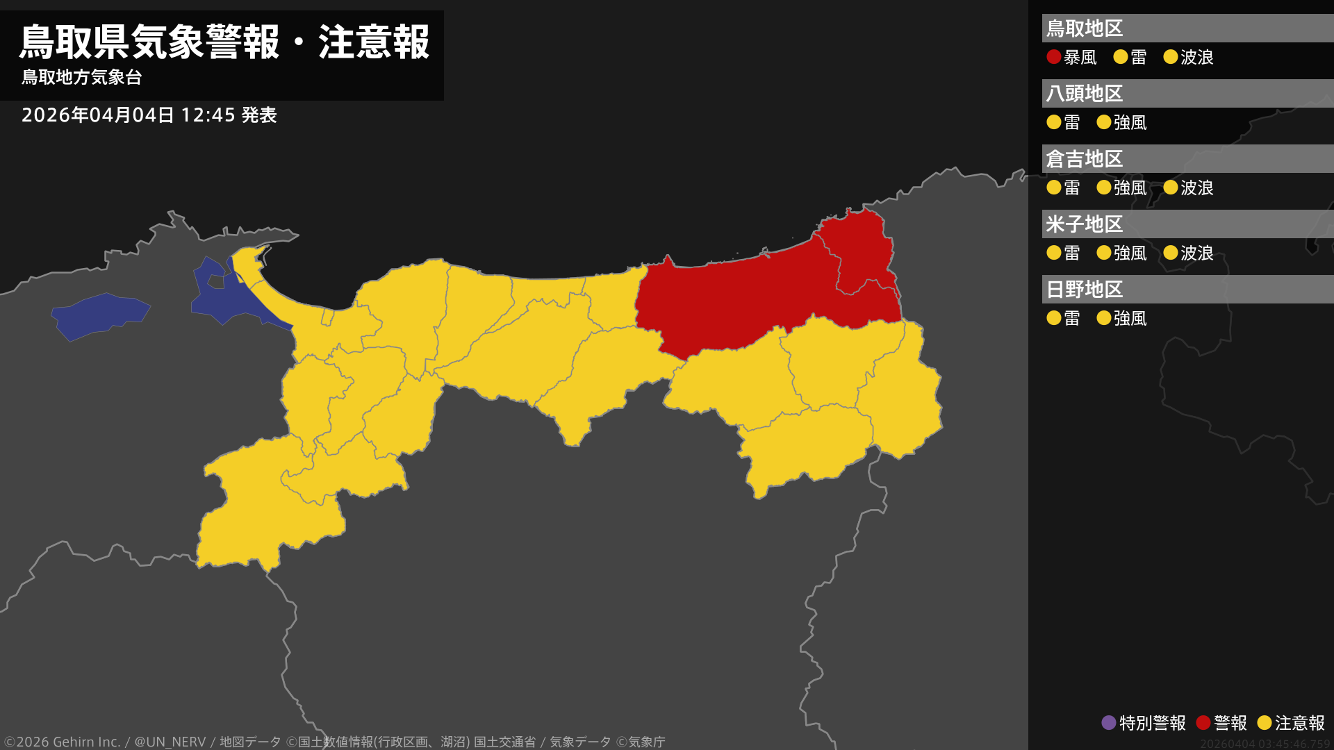 【富山県 気象警報・注意報 2026年04月04日 23:20】富山県では、強風や融雪による土砂災害に注意してください。東部では、なだれに注意してください。#気象警報注意報 #富山県