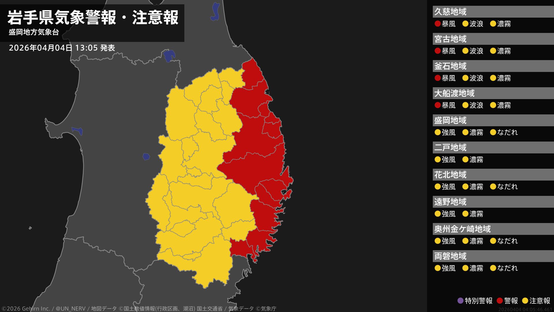 【宮城県 気象警報・注意報 2026年04月05日 01:43】東部では、強風や高波に注意してください。宮城県では、濃霧による視程障害に注意してください。#気象警報注意報 #宮城県