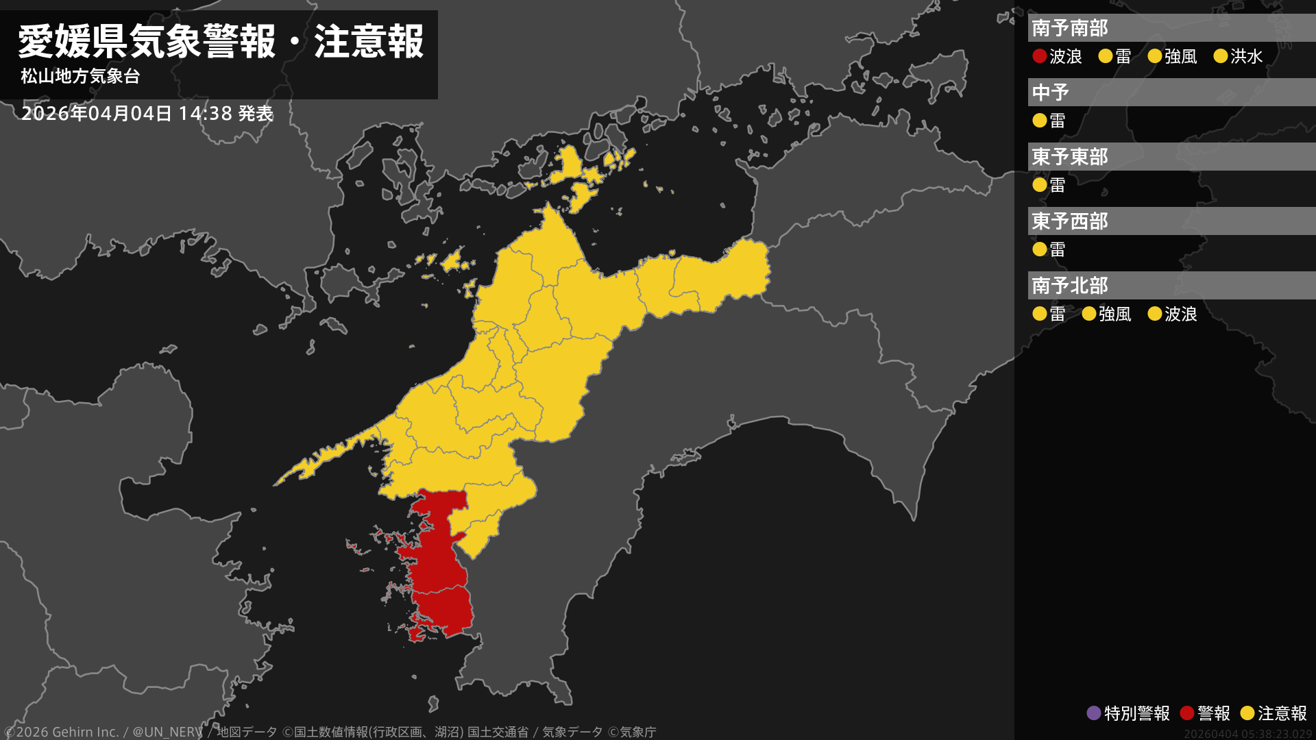 【愛知県 気象警報・注意報 2026年04月04日 23:41】東部では、5日明け方まで強風に注意してください。愛知県では、5日昼前まで高波に、5日未明まで急な強い雨や落雷に注意してください。#気象警報注意報 #愛知県