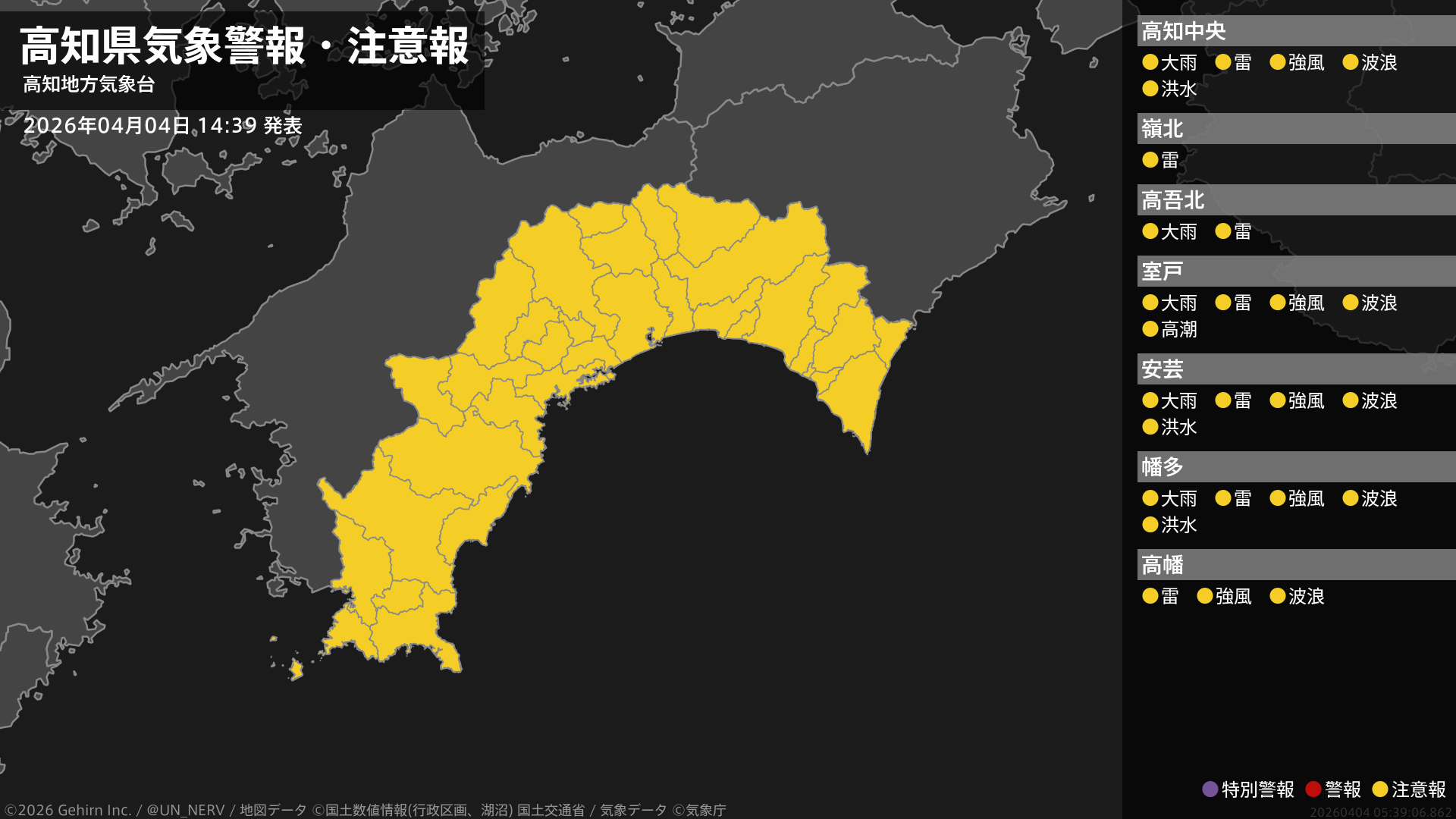【高知県 気象警報・注意報 2026年04月04日 23:52】東部では、5日明け方まで強風に注意してください。中部、西部では5日明け方まで、東部では5日昼前まで、高波に注意してください。#気象警報注意報 #高知県