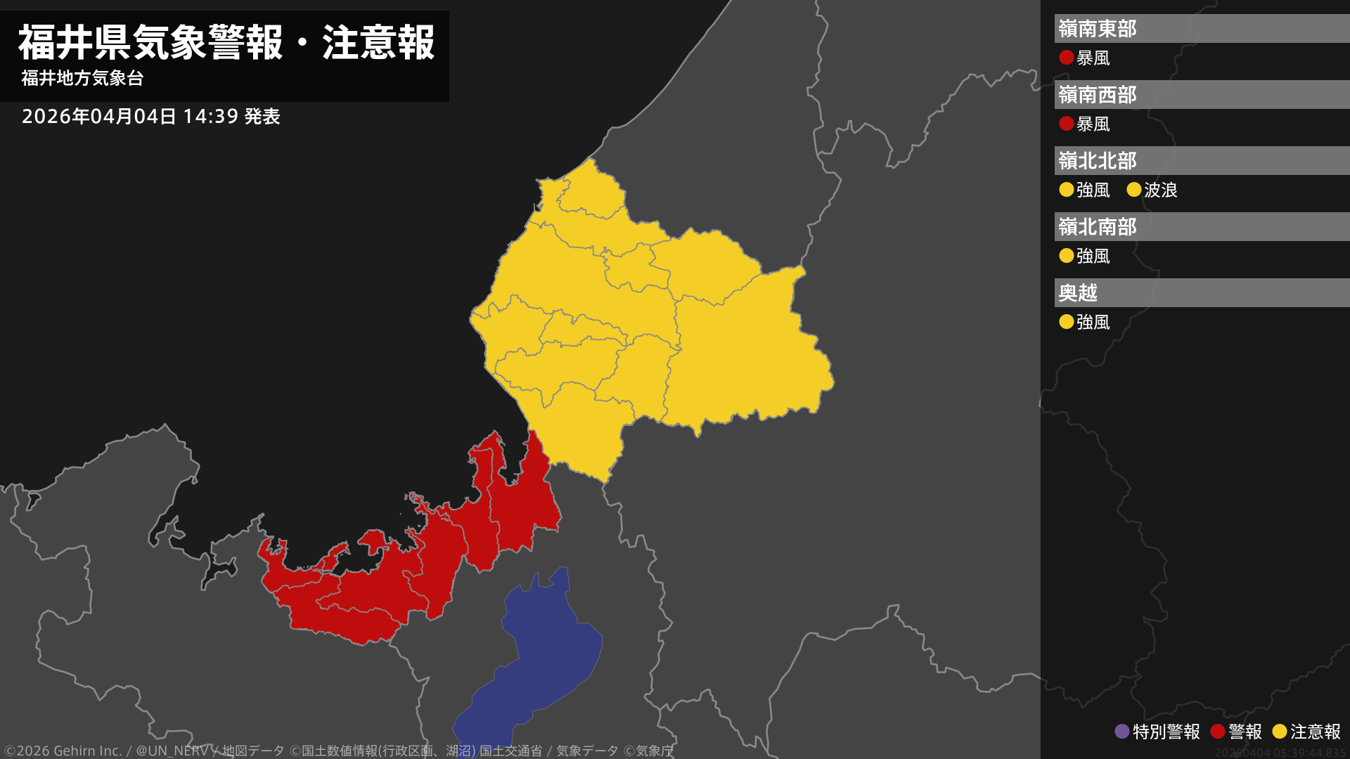 【福井県 気象警報・注意報 2026年04月05日 00:06】福井県では、5日明け方まで強風に注意してください。#気象警報注意報 #福井県