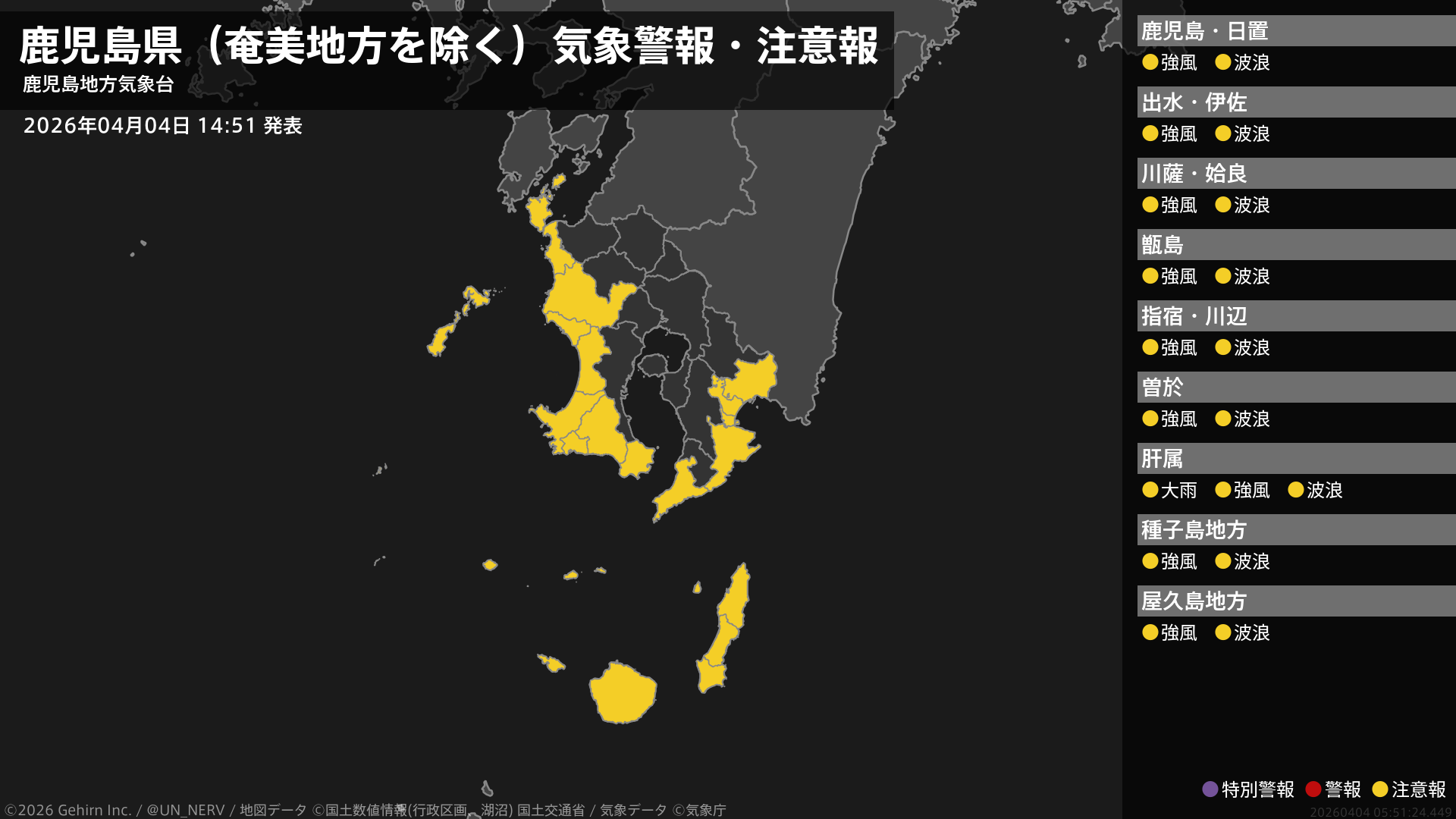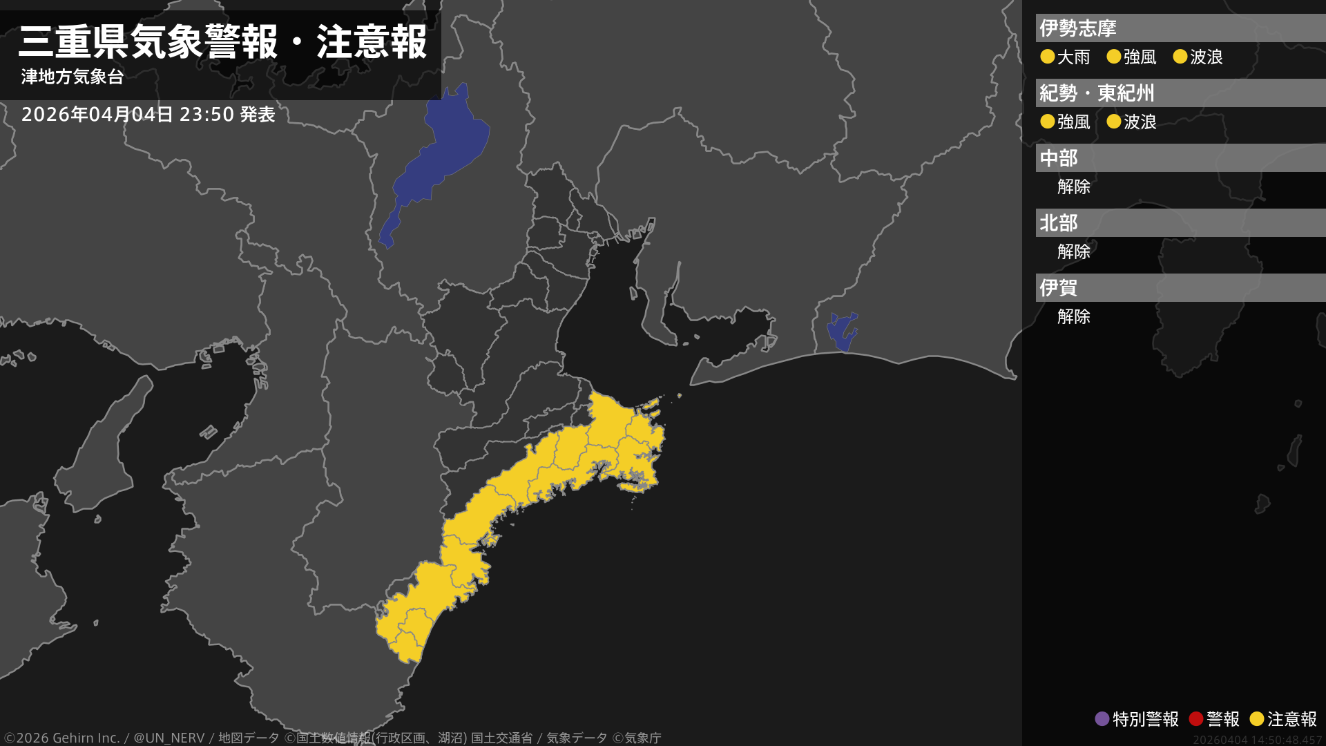 【三重県 気象警報・注意報 2026年04月04日 23:50】南部では、5日明け方まで土砂災害や強風に、5日昼前まで高波に注意してください。#気象警報注意報 #三重県