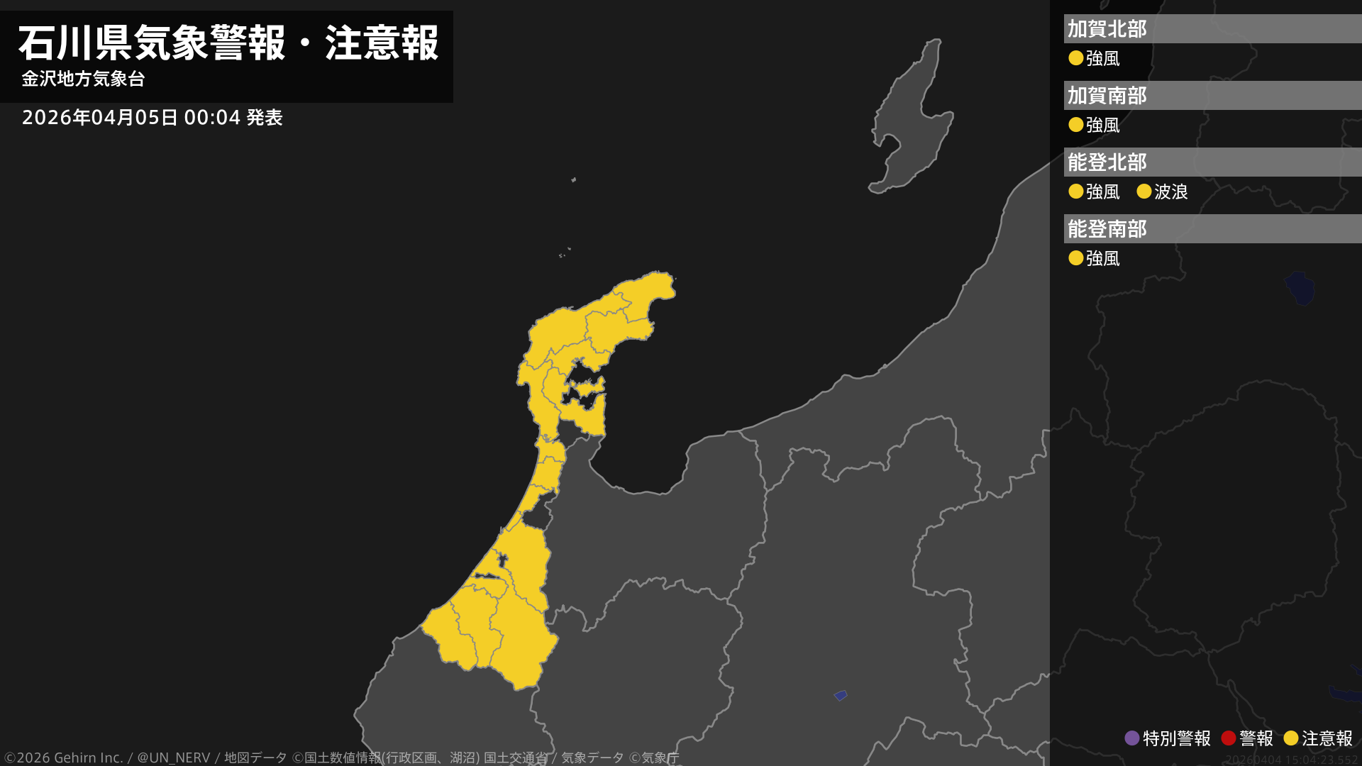 【石川県 気象警報・注意報 2026年04月05日 00:04】石川県では、5日明け方まで強風に注意してください。能登では、5日明け方まで高波に注意してください。#気象警報注意報 #石川県