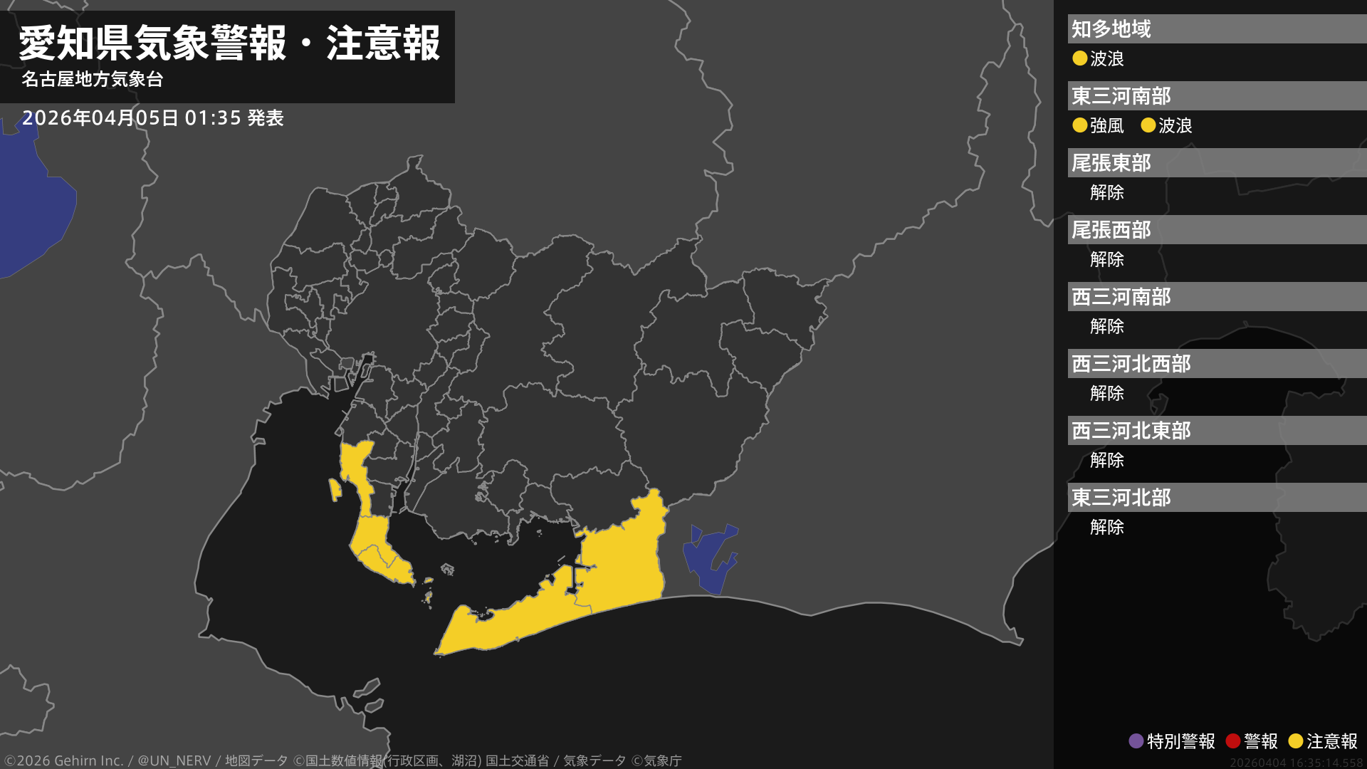 【愛知県 気象警報・注意報 2026年04月05日 01:35】東部では、5日明け方まで強風に注意してください。愛知県では、5日昼前まで高波に注意してください。#気象警報注意報 #愛知県