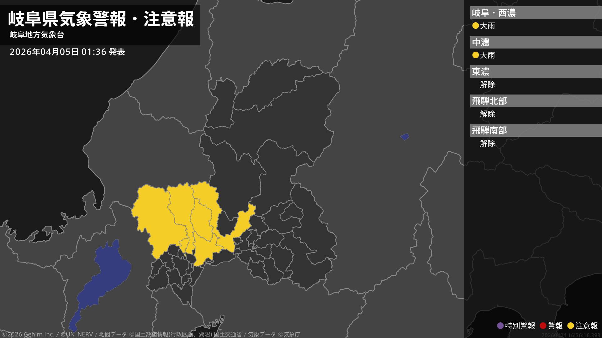 【岐阜県 気象警報・注意報 2026年04月05日 01:36】美濃地方では、5日明け方まで土砂災害に注意してください。#気象警報注意報 #岐阜県
