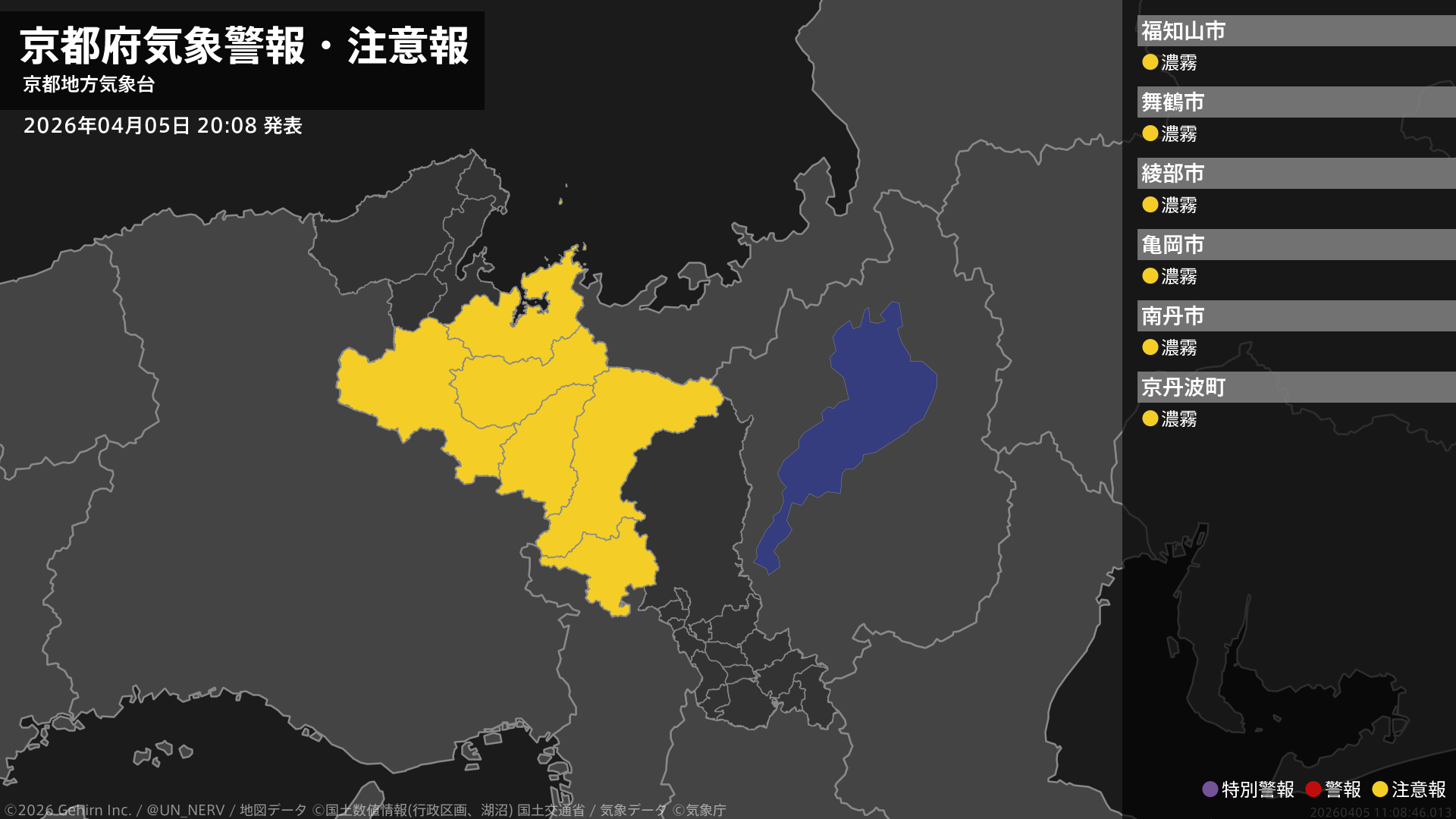 【京都府 気象警報・注意報 2026年04月05日 20:08】京都府では、6日未明から6日昼前まで濃霧による視程障害に注意してください。#気象警報注意報 #京都府