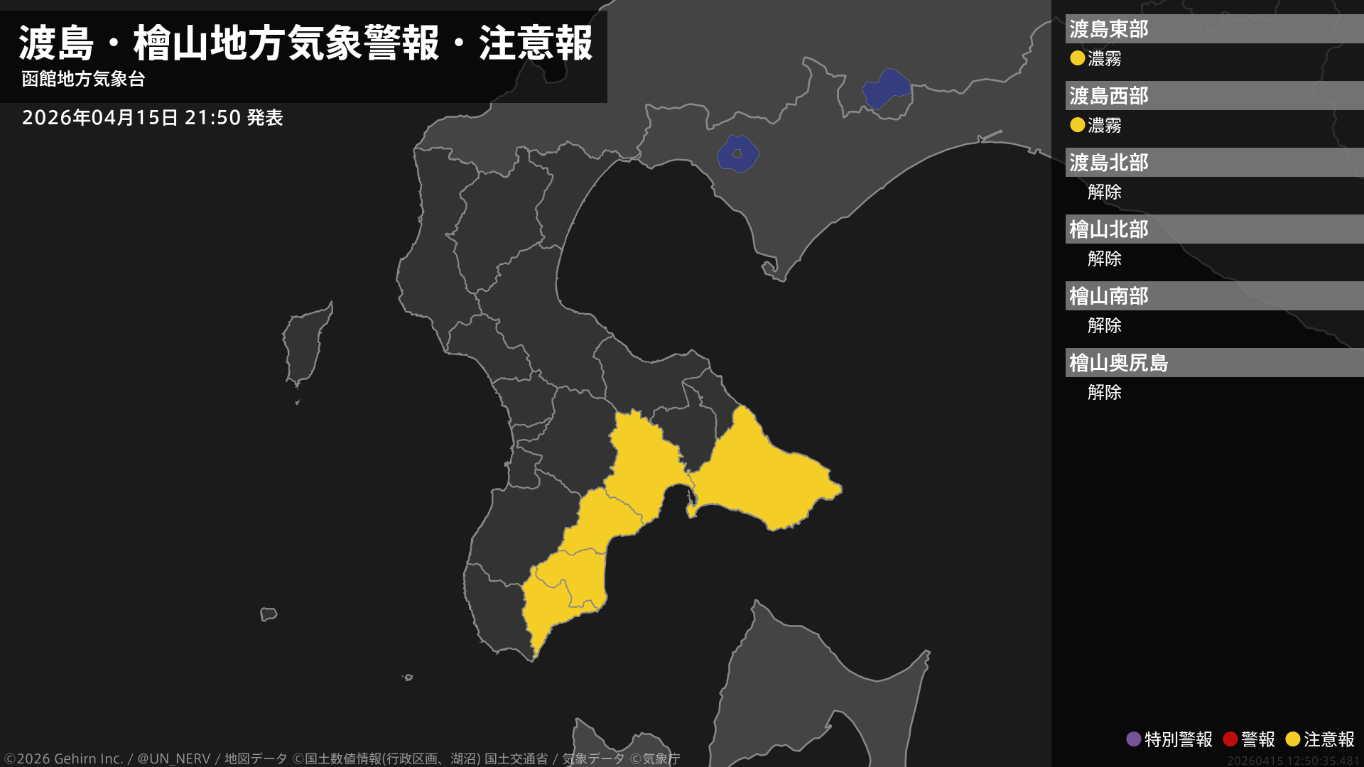 【渡島・檜山地方 気象警報・注意報 2026年04月18日 00:39】渡島、檜山地方では、18日明け方から18日昼過ぎまで急な強い雨や落雷に注意してください。#気象警報注意報 #渡島地方 #檜山地方