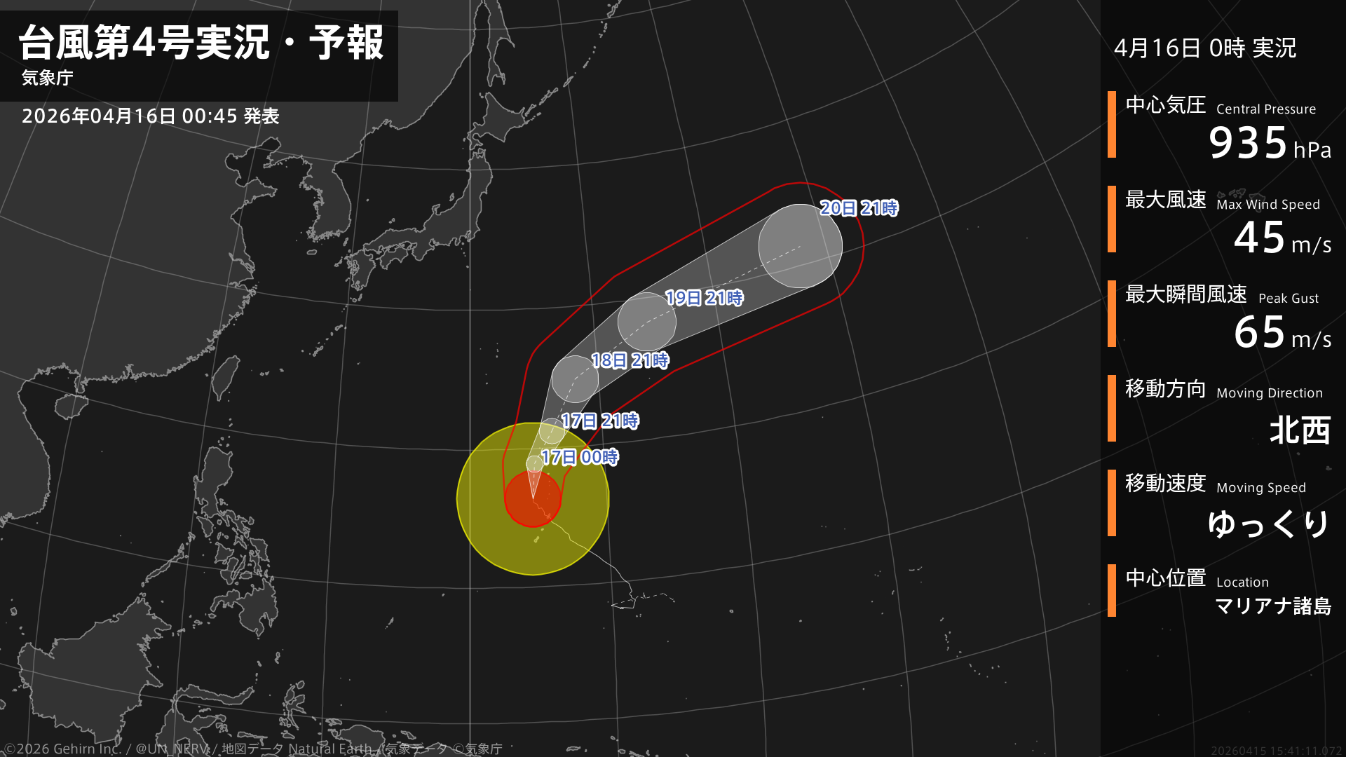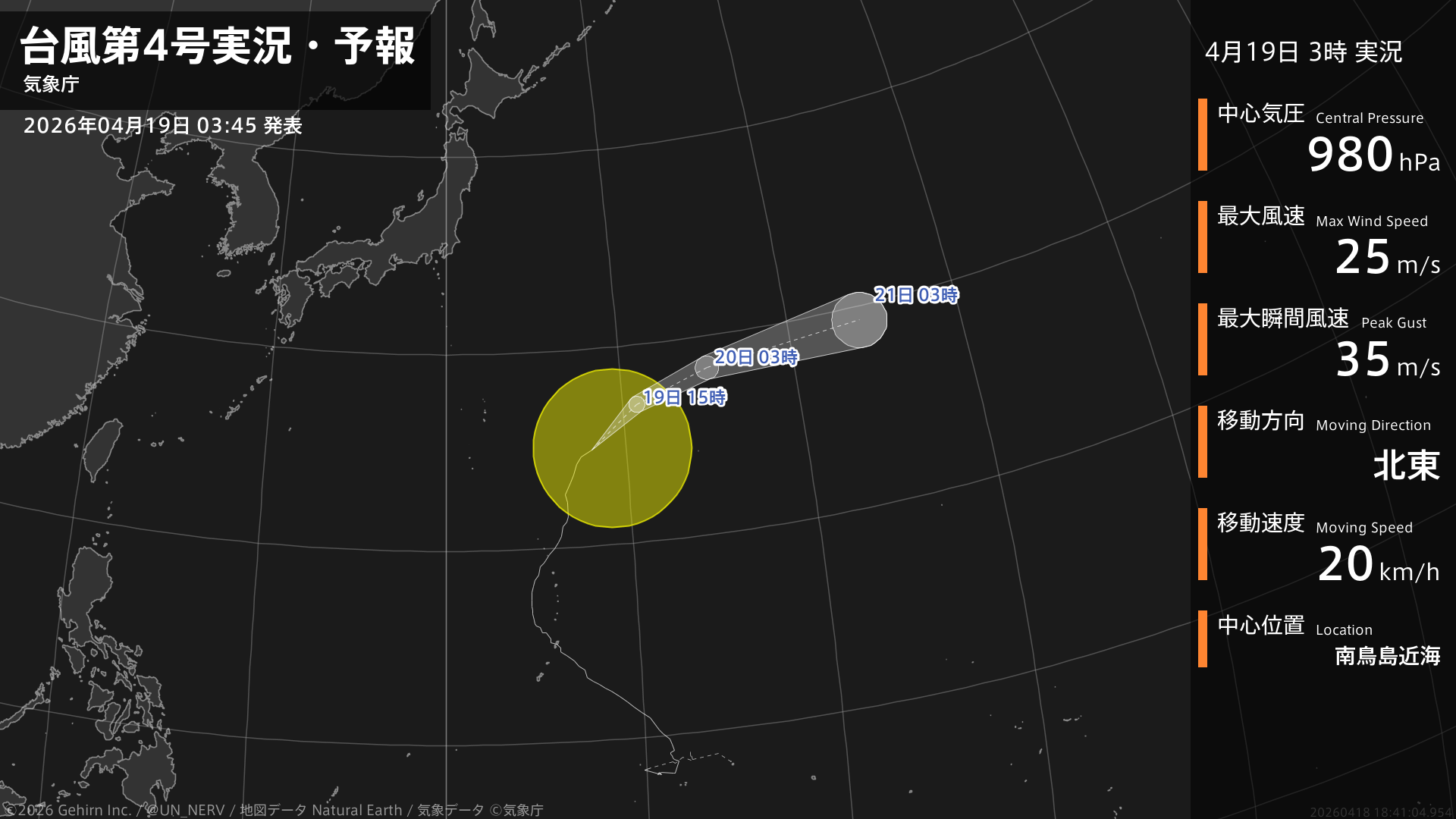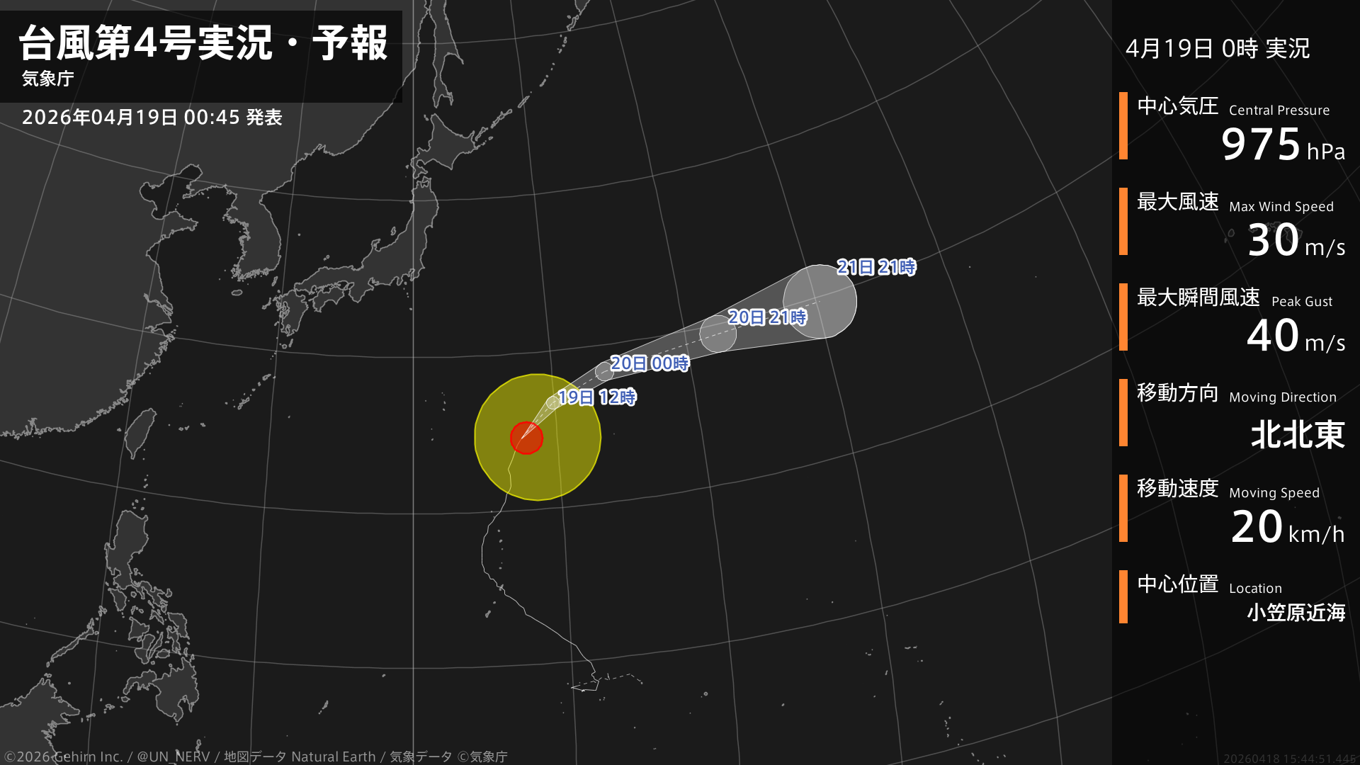 【台風第4号実況・予報 2026年04月18日 00:41】大型で強い台風第4号(シンラコウ)は、小笠原近海を1時間に15キロの速さで北北東に進んでいます。#台風情報