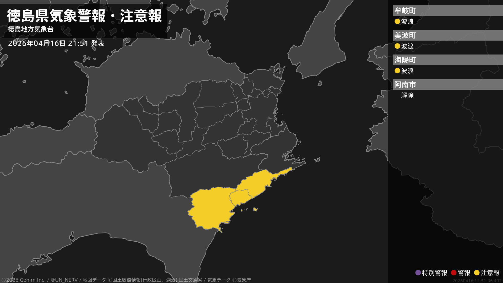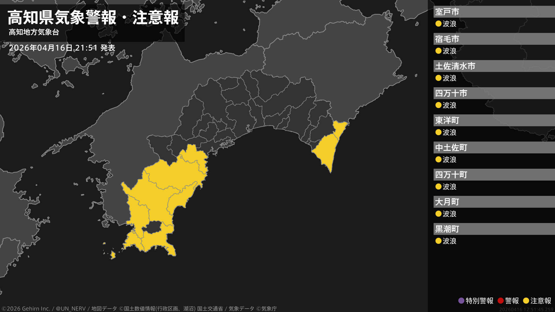 【高知県 気象警報・注意報 2026年04月16日 16:06】東部では、強風に注意してください。東部、西部では、高波に注意してください。#気象警報注意報 #高知県