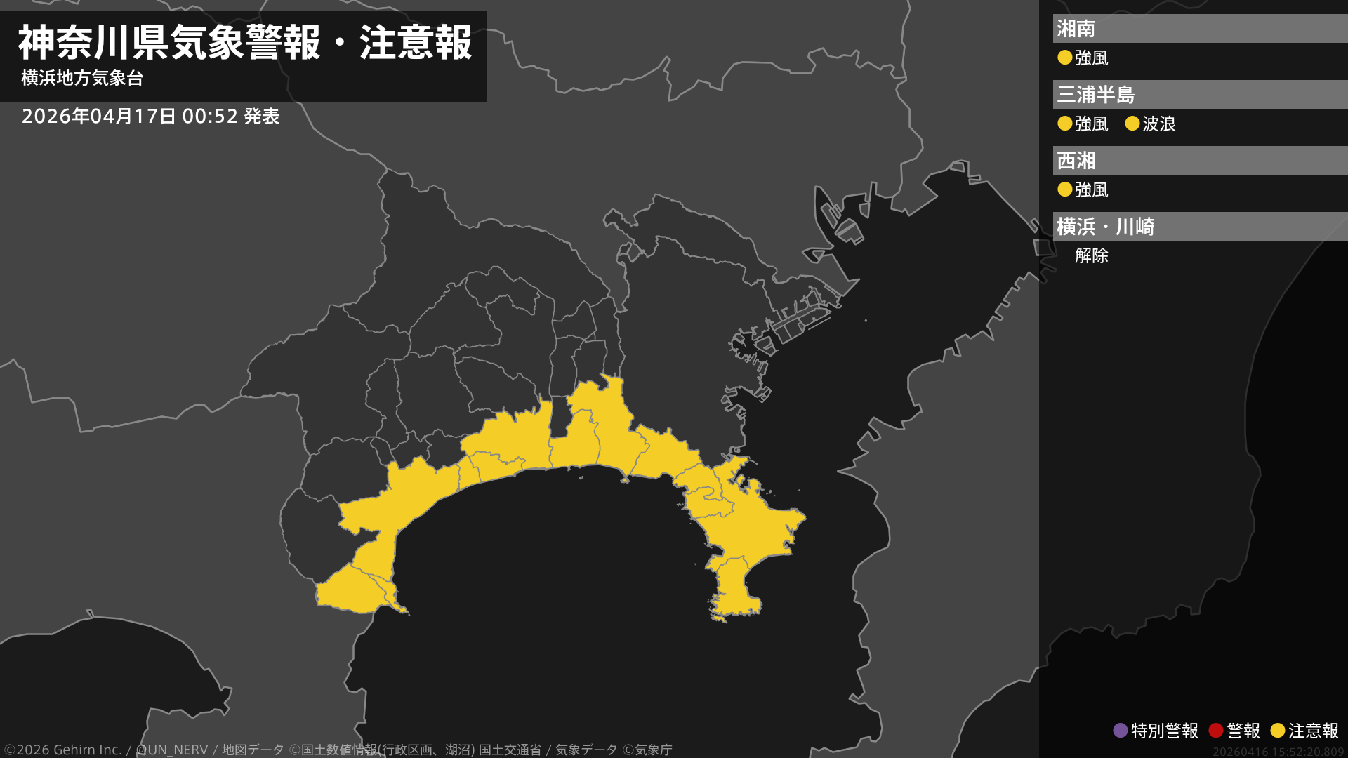 【神奈川県 気象警報・注意報 2026年04月16日 16:19】神奈川県では、17日明け方まで強風に注意してください。東部では、16日夜のはじめ頃から17日明け方まで高波に注意してください。#気象警報注意報 #神奈川県