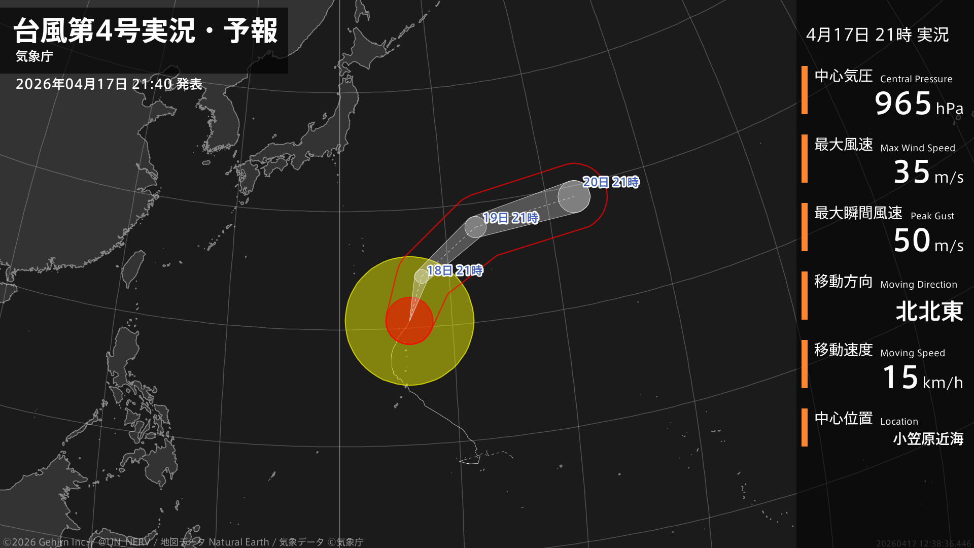 【台風第4号実況・予報 2026年04月17日 21:38】大型で強い台風第4号(シンラコウ)は、小笠原近海を1時間に15キロの速さで北北東に進んでいます。#台風情報