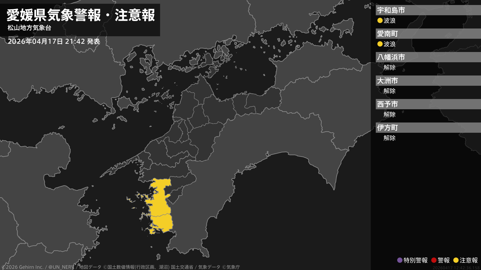 【愛媛県 気象警報・注意報 2026年04月17日 21:42】南予では、18日夕方まで高波に注意してください。#気象警報注意報 #愛媛県