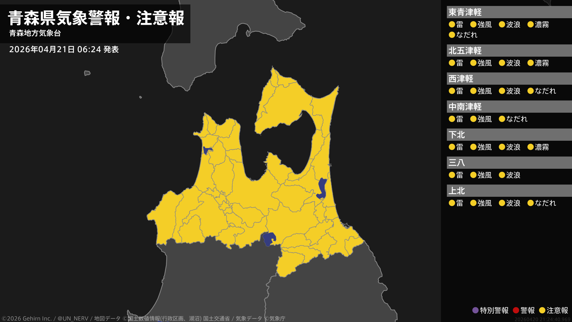 【青森県 気象警報・注意報 2026年04月20日 06:06】青森県では、20日まで空気の乾燥した状態が続くため、火の取り扱いに注意してください。津軽、三八上北では、ここしばらくなだれに注意してください。#気象警報注意報 #青森県