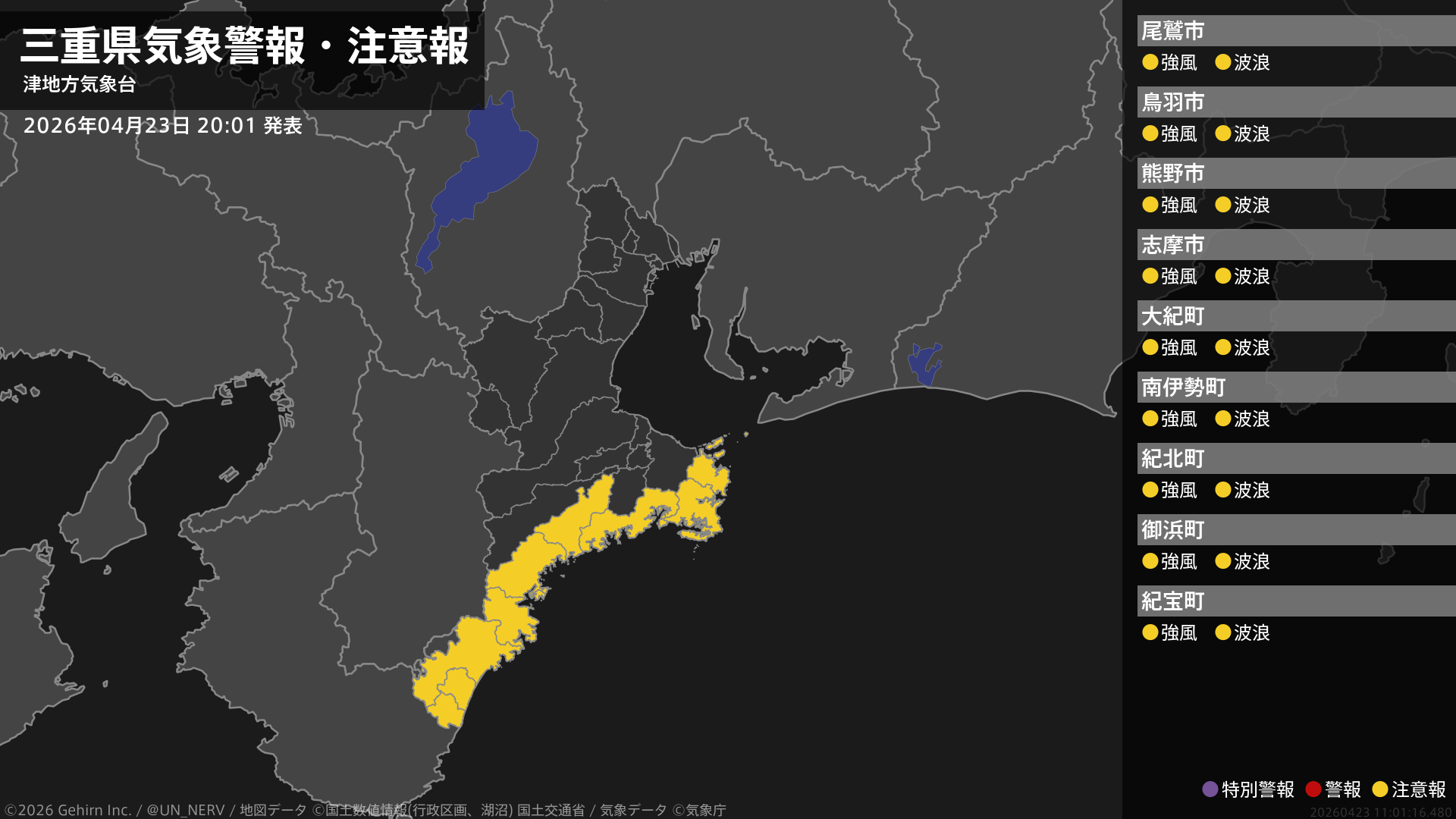 【三重県 気象警報・注意報 2026年04月23日 20:01】南部では、23日夜遅くまで強風に、24日明け方まで高波に注意してください。#気象警報注意報 #三重県