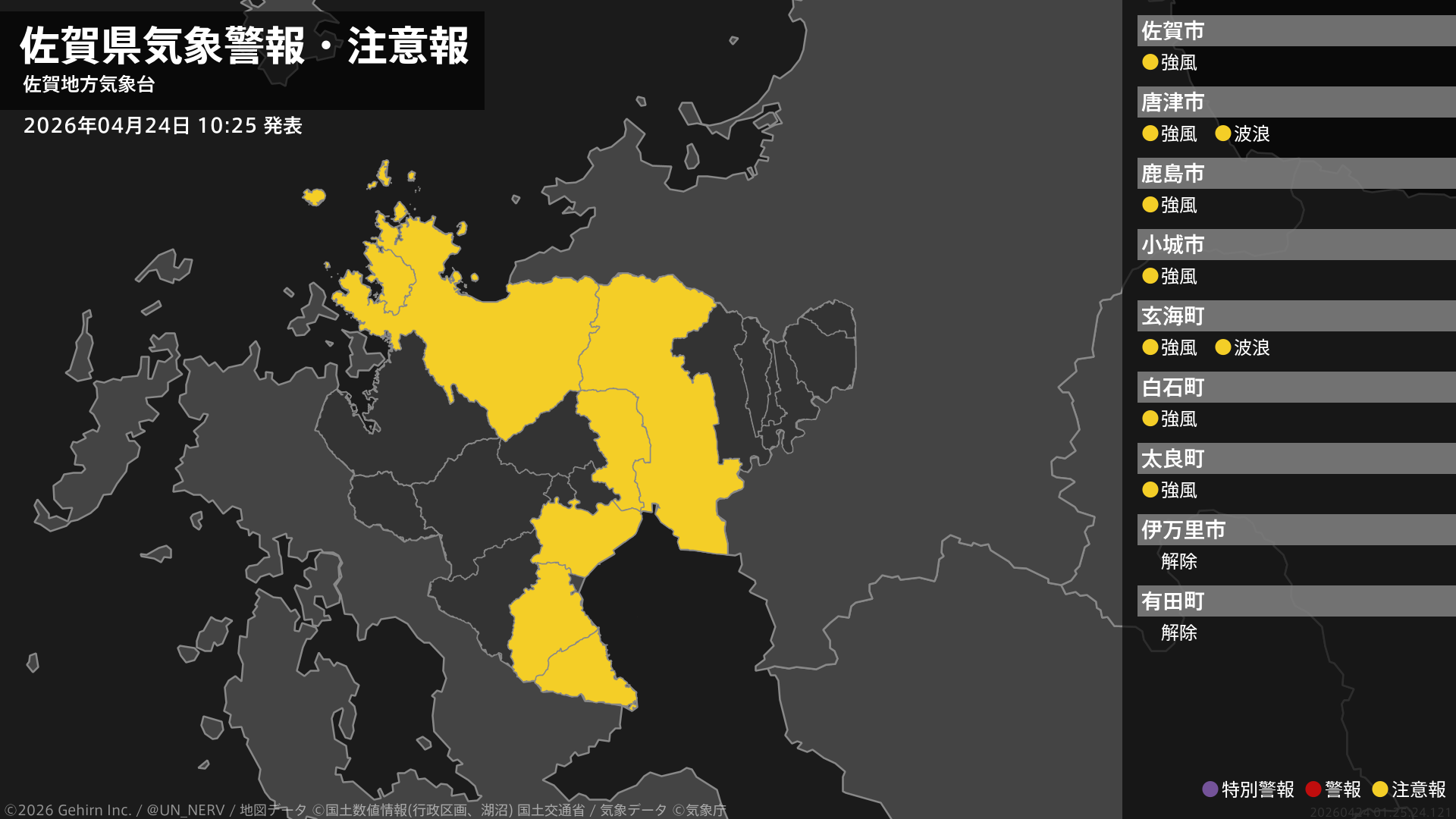 【佐賀県 気象警報・注意報 2026年04月23日 16:16】佐賀県では、強風に注意してください。北部では、高波に注意してください。#気象警報注意報 #佐賀県