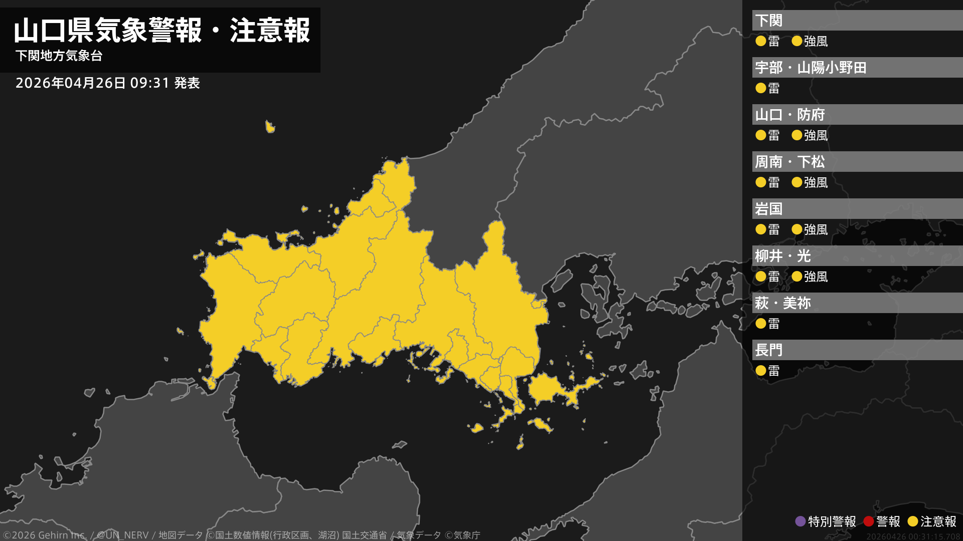 【山口県 気象警報・注意報 2026年04月26日 09:31】西部、中部、東部では、強風に注意してください。山口県では、急な強い雨や落雷に注意してください。#気象警報注意報 #山口県