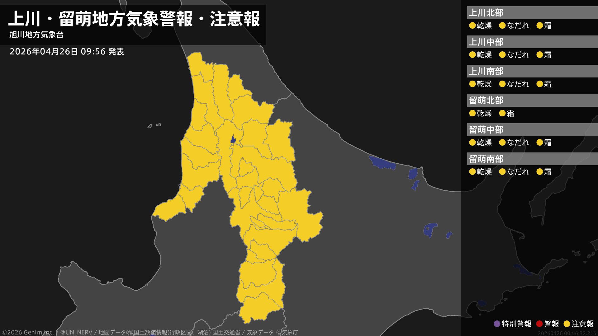 【上川・留萌地方 気象警報・注意報 2026年04月26日 09:56】上川、留萌地方では、26日まで空気の乾燥した状態が続くため、火の取り扱いに、27日までなだれに、27日朝は霜に対する農作物の管理に注意してください。#気象警報注意報 #上川地方 #留萌地方