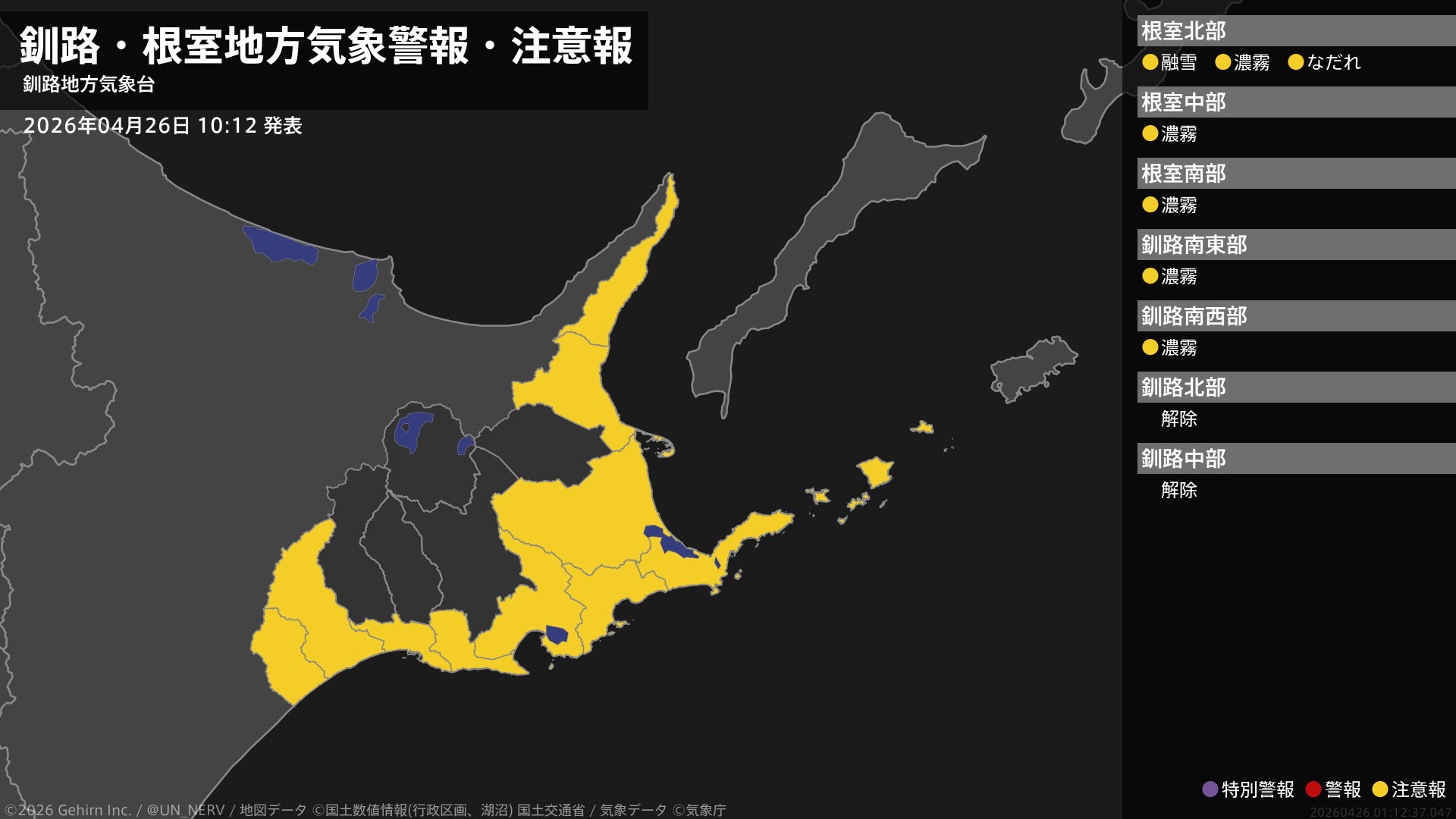【釧路・根室地方 気象警報・注意報 2026年04月26日 10:12】根室地方では、融雪による土砂災害やなだれに注意してください。根室、釧路地方では、濃霧による視程障害に注意してください。#気象警報注意報 #根室地方 #釧路地方