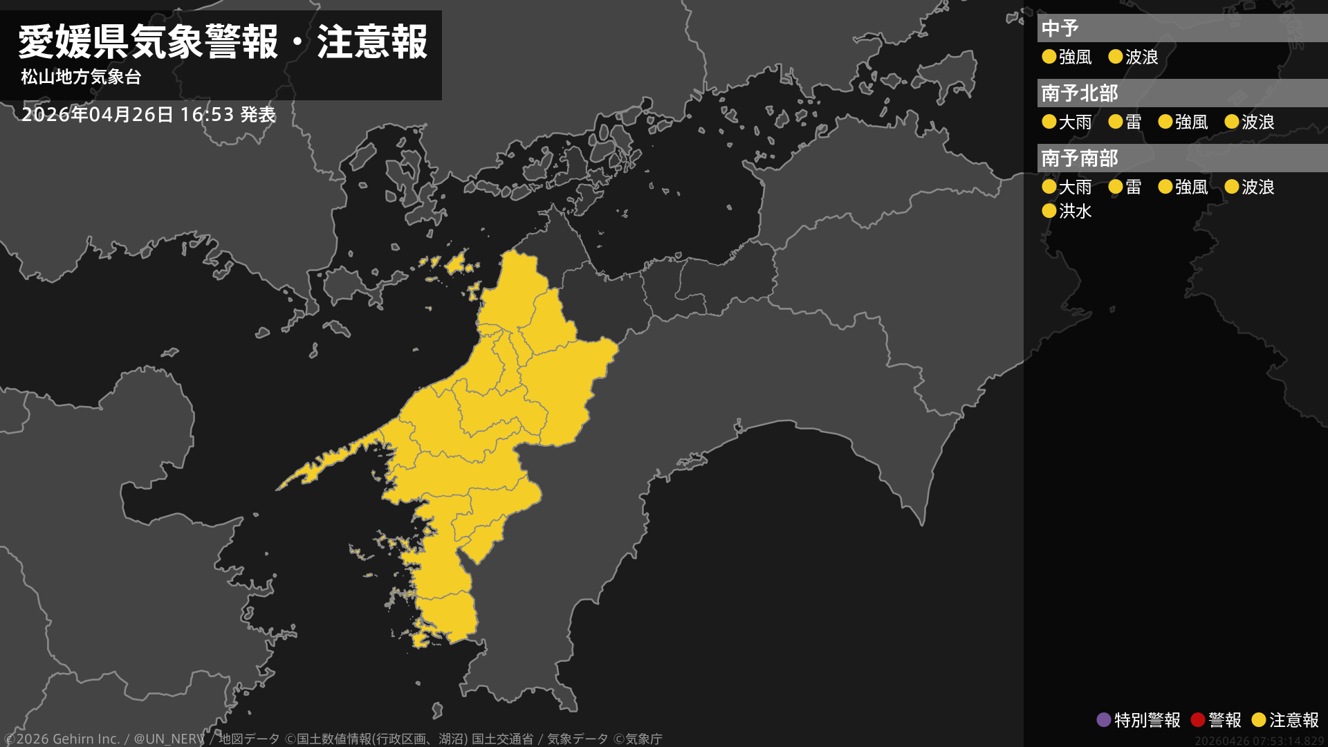 【愛媛県 気象警報・注意報 2026年04月26日 10:05】中予、南予では、26日昼過ぎから26日夜遅くまで強風や高波に注意してください。南予では、26日昼過ぎから26日夜遅くまで急な強い雨や落雷に注意してください。#気象警報注意報 #愛媛県