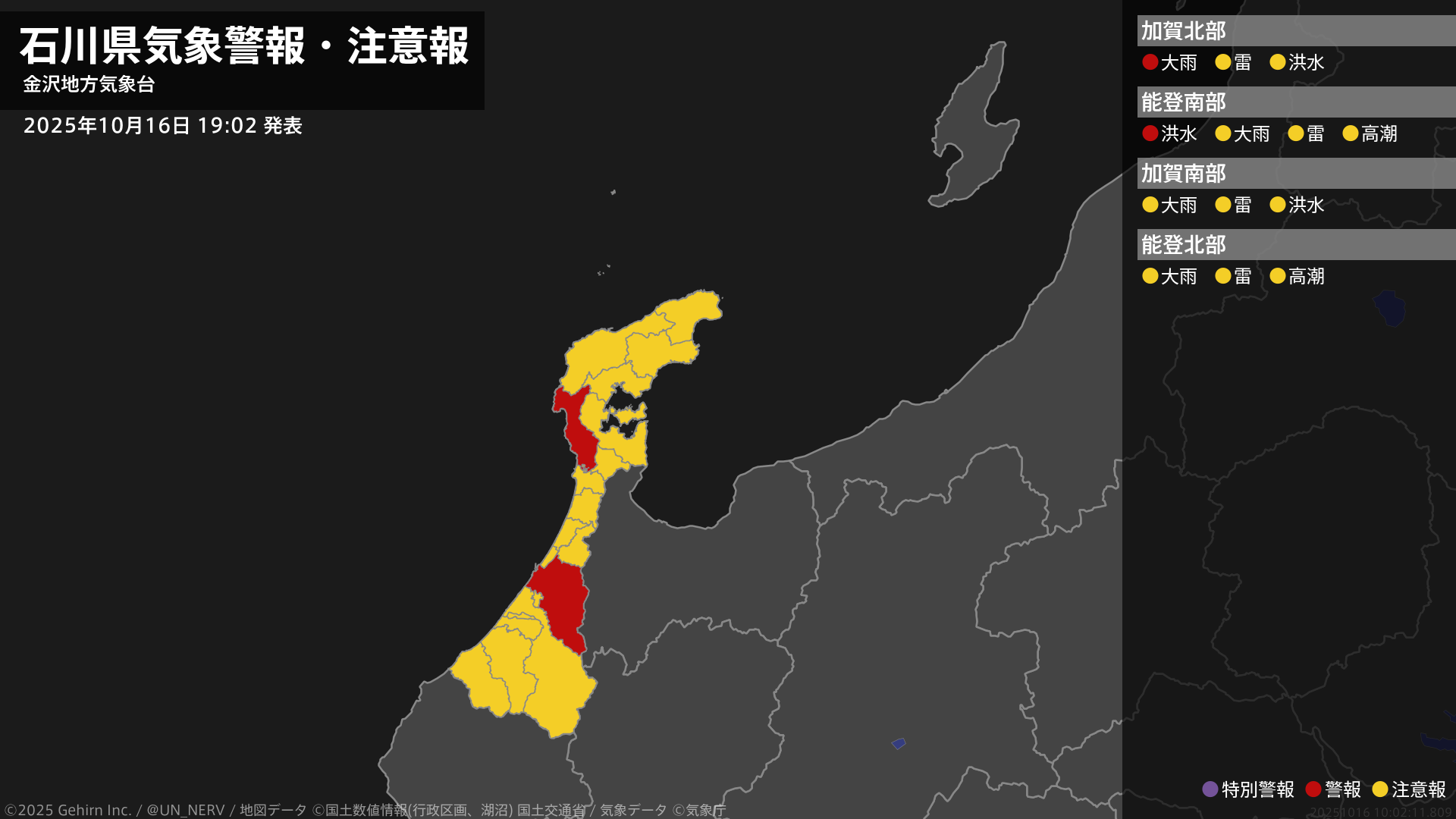 【石川県 気象警報・注意報 2025年10月16日 19:54】能登では、土砂災害や高潮に注意してください。石川県では、低い土地の浸水や河川の増水、落雷に注意してください。#気象警報注意報 #石川県