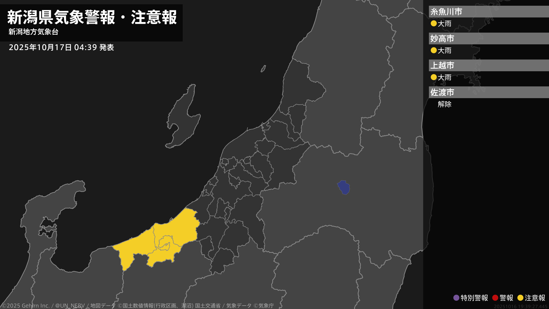【新潟県 気象警報・注意報 2025年10月17日 05:39】注意報を解除します。#気象警報注意報 #新潟県