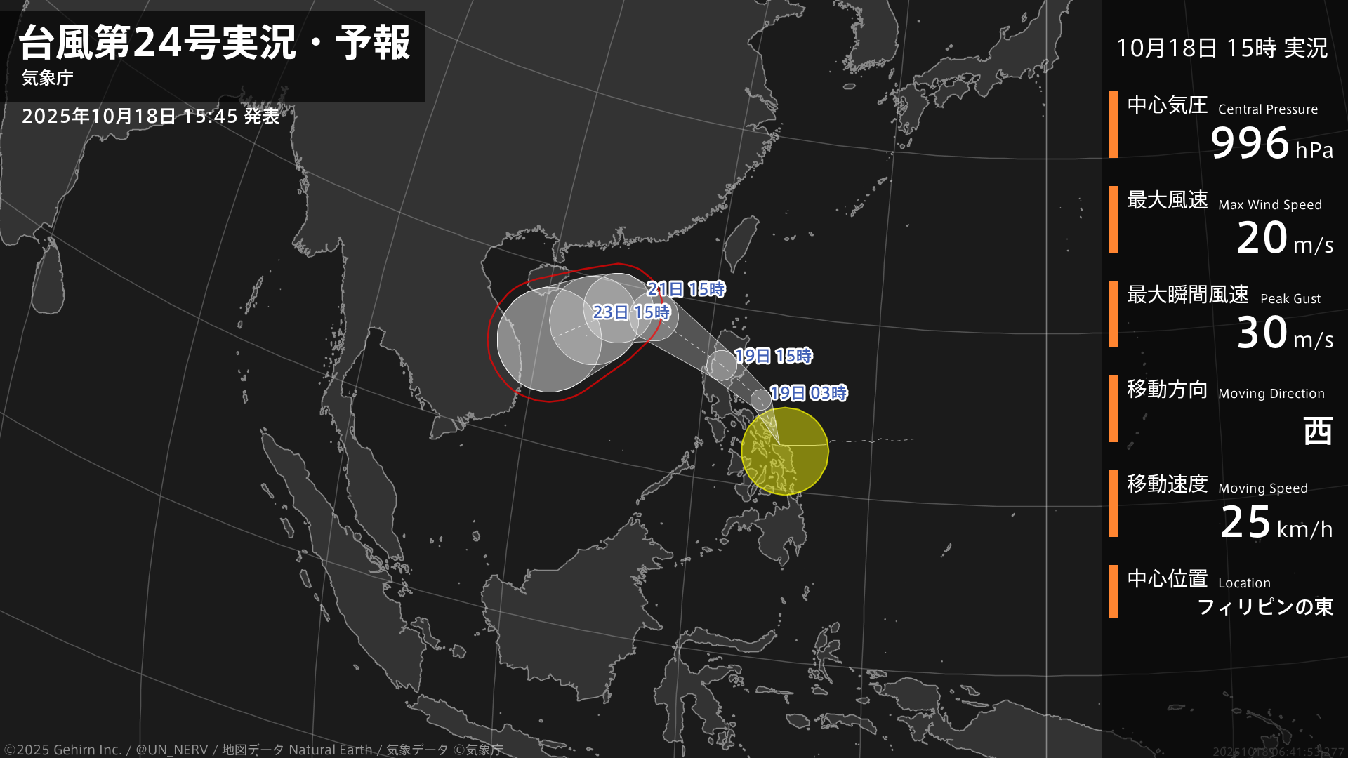 【台風第24号実況・予報 2025年10月18日 15:41】台風第24号(フンシェン)は、フィリピンの東を1時間に25キロの速さで西に進んでいます。#台風情報