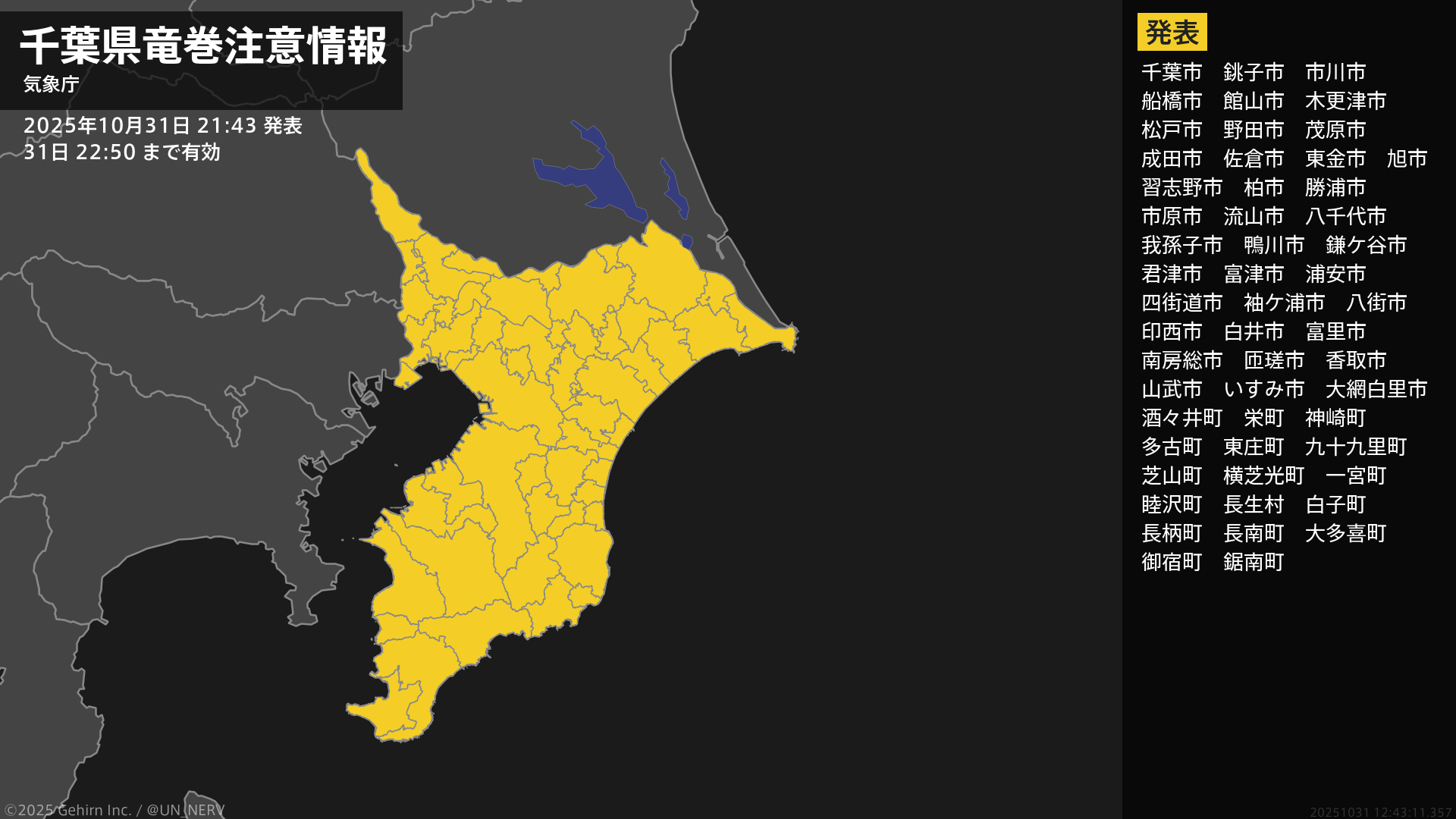 千葉県は、竜巻などの激しい突風が発生しやすい気象状況になっています。頑丈な建物内に移動するなど安全確保に努めてください。この情報は31日23:50まで有効です。