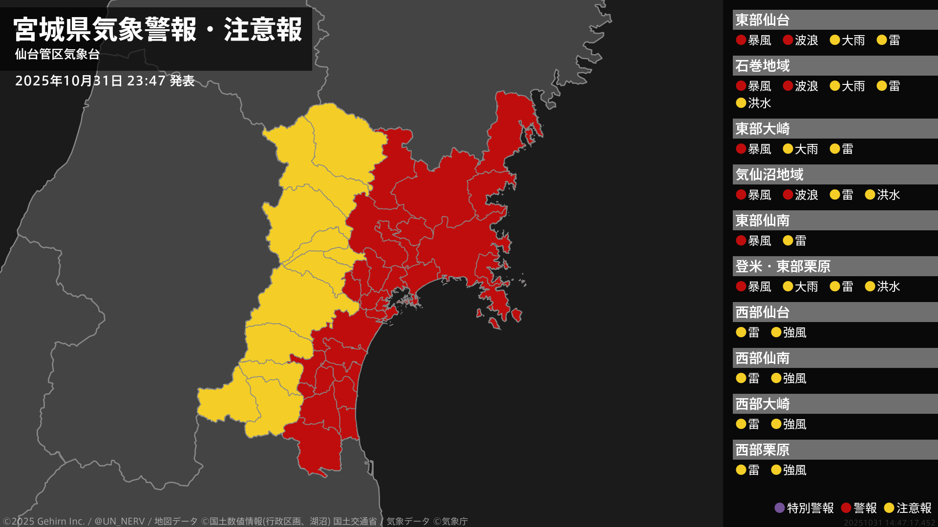 【宮城県 気象警報・注意報 2025年10月31日 23:47】東部では、1日未明から1日夕方まで暴風に、1日明け方から1日昼過ぎまで高波に警戒してください。#気象警報注意報 #宮城県