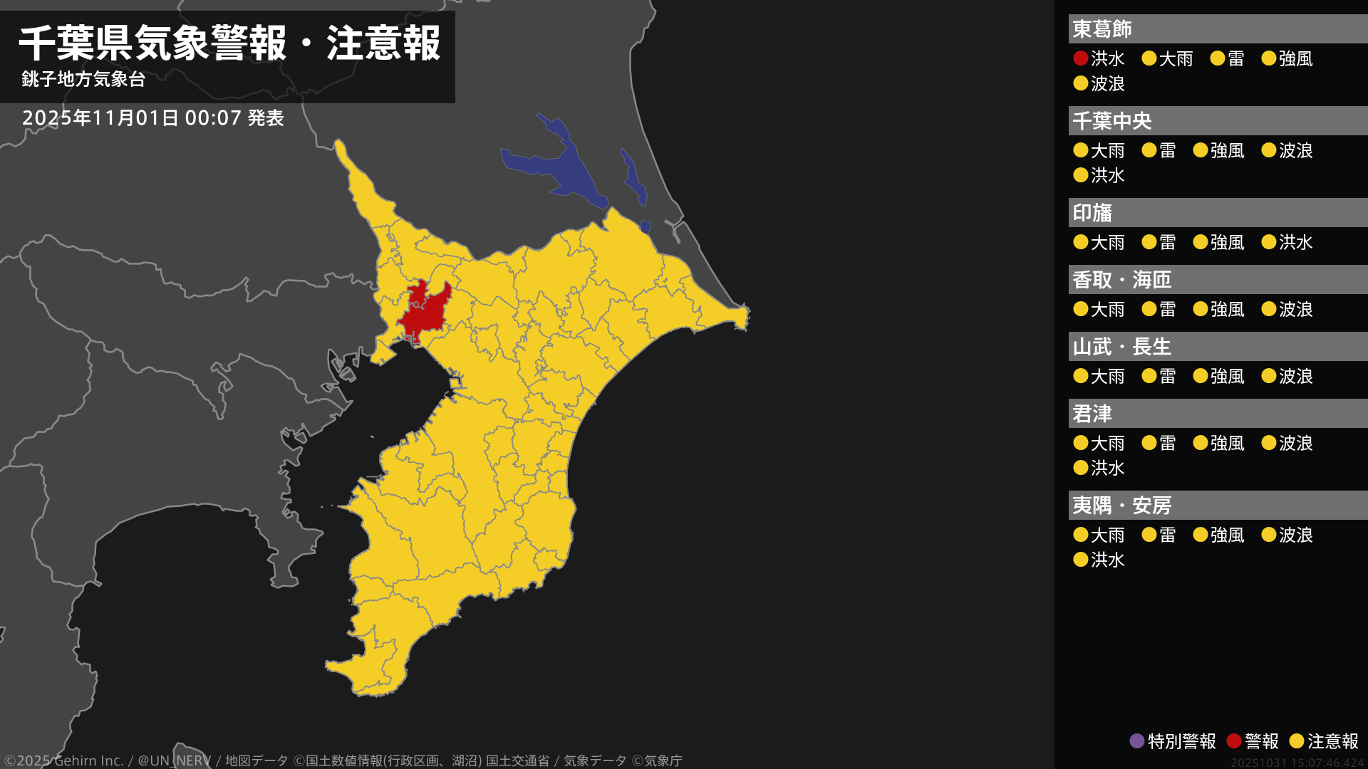 【千葉県 気象警報・注意報 2025年11月01日 00:07】北西部では、1日未明まで河川の増水に警戒してください。#気象警報注意報 #千葉県