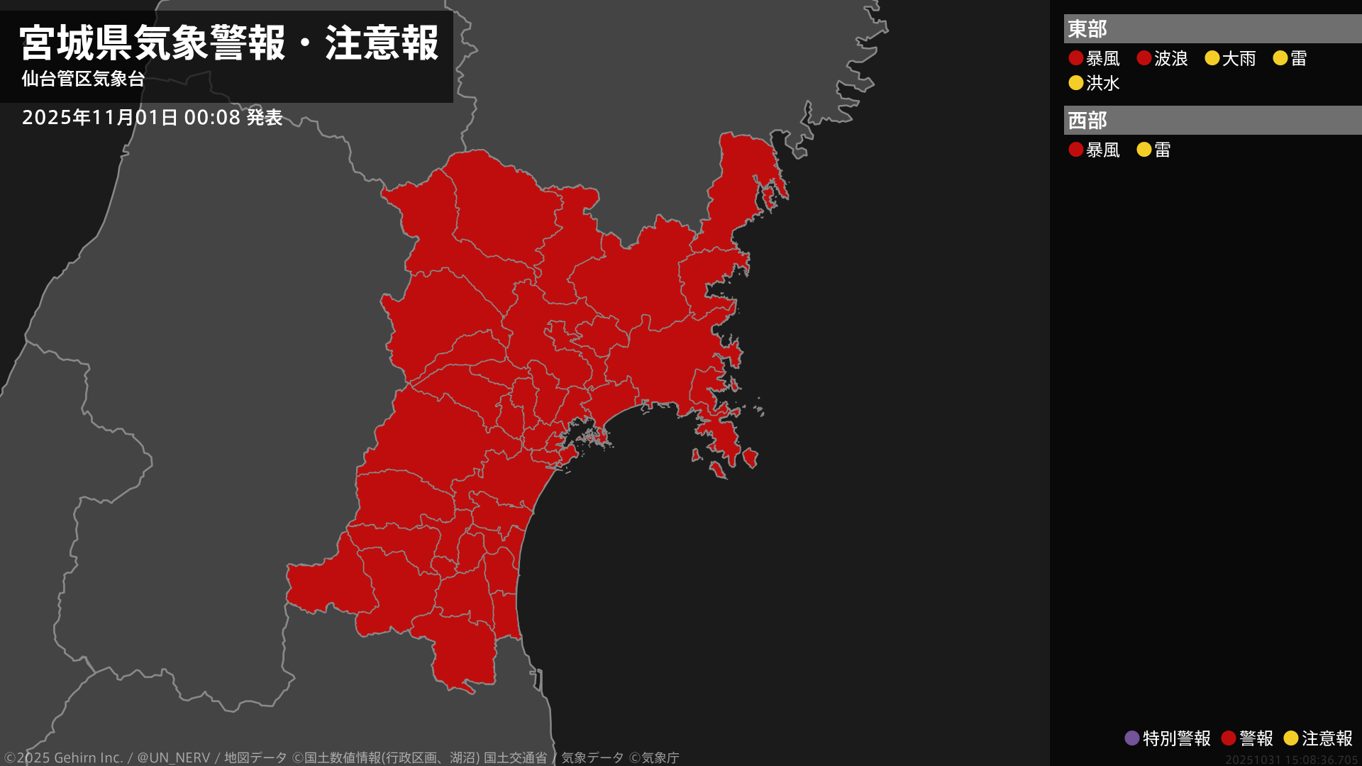 【宮城県 気象警報・注意報 2025年11月01日 00:08】東部では1日夕方まで、西部では1日朝から1日夕方まで、暴風に警戒してください。宮城県では、1日明け方から1日昼過ぎまで高波に警戒してください。#気象警報注意報 #宮城県